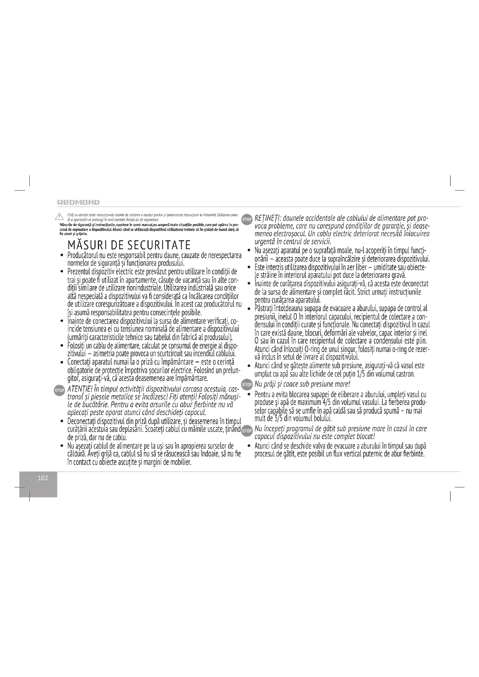 începe după sau după realizarea temperaturii și presiunii necesare în castron. În unele programe automate, numărătoarea timpului de gătit set începe numai după ce dispozitivul a ajuns la temperatura de funcţionare setată. De exemplu, în programul STEAM/BOIL numărătoarea inversă începe doar după ce apa este artă şi se formea- ză sucient abur dens în bol. În timp ce atinge caracteristicile stabilite şi indicatorii clipesc, iar scara nivelului de presiune este umplut. Atunci când se utilizează programele în modul oală sub presiune, scara nivelului de presiune este umplută până la valoarea stabilită a presiunii. Odată ce caracteristicile de lucru sunt atinse, dispozitivul dă un semnal sonor. Indicatorul se opreşte din clipit, scara indi- catorului şi a nivelului de presiune se stinge sau se aprinde continuu în cazul în care programul funcţionează sub presiune. 11. Trei semnale sonore scurte anunță că un program de gătit s-a terminat. Odată ce programul de funcționare/păstrați cald este de peste, inscripția „End” apare pe ecran pentru câteva secunde. 12. Atunci când se utilizează programele de mod oală sub presiune, la nalizarea gătitului lăsați dispozitivul să se răcească timp de câteva minute. Apoi aduceți supapa de abur în pozițiile deschise pentru a normaliza presiunea din camera de lucru. Apăsaţi butonul pentru a anula programul introdus, întrerupe procesul de gătit sau păstraţi cald. NU: – umpleţi bolul cu produse şi apă peste marcajul maxim de pe suprafaţa interioară a bolului; – se prepară în modul oală sub presiune fără a adăuga apă sau alte lichide (min. nivelul necesar de uid este de 2 căni de măsurare); – utilizaţi modul oală sub presiune pentru a prăji produse pe ulei. Pentru a obţine un rezultat de înaltă calitate, vi se sugerează să utilizaţi reţetele pentru gătit din cartea de bucate ataşată la multi- coker presiune, conceput special pentru acest model. Reţete relevante pot găsite, de asemenea, pe site-ul www.redmond.company. Tabelul setărilor implicite Program Recomandări de utilizareTimp implicitInterval de ajustare/creșteriGătit sub presiuneTimp De ÎntârziereAșteptând să acceseze parametrii de funcționareKeep Warm (Încălzește-Te)RICE/GRAINBoabe de gătit întregi și zdrobite, precum și di-verse feluri de mâncare laterale 0:10 1 min – 2 ore / 1 min SLOW COOKCook lapte copt, conserve de carne, înainte de cuțit, jeleu de carne și aspic 1:00 1 min – 5 ore / 1 min