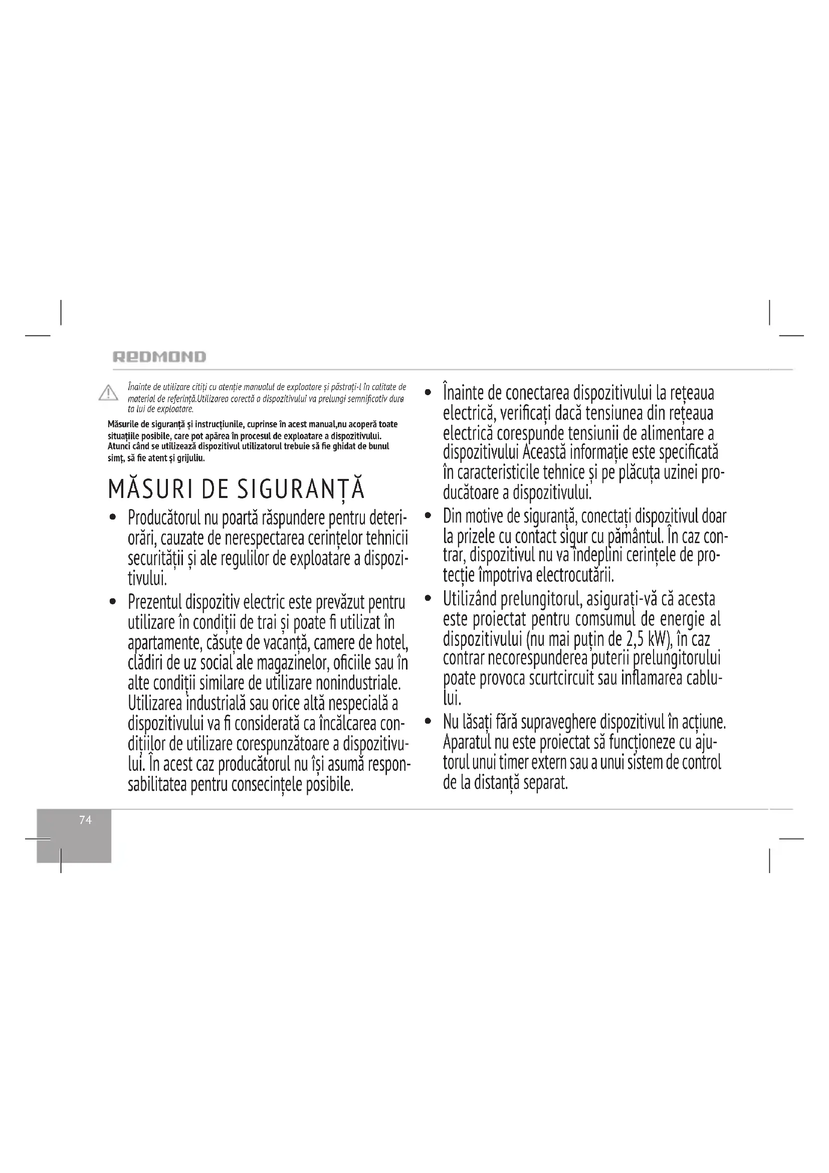 Prezentul dispozitiv electric este prevăzut pentru utilizare în condiţii de trai și poate utilizat în apartamente, căsuţe de vacanţă, camere de hotel, clădiri de uz social ale magazinelor, ociile sau în alte condiţii similare de utilizare nonindustriale. Utilizarea industrială sau orice altă nespecială a dispozitivului va considerată ca încălcarea con- diţiilor de utilizare corespunzătoare a dispozitivu- lui. În acest caz producătorul nu își asumă respon- sabilitatea pentru consecinţele posibile.