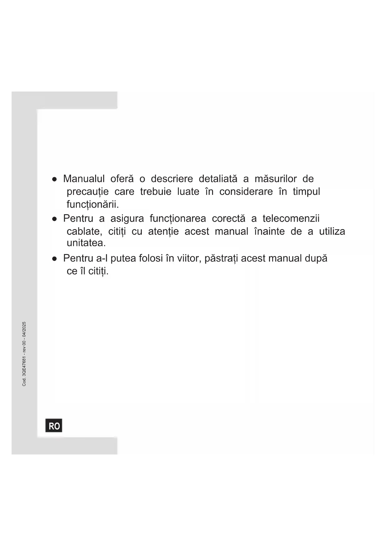 Cod. 3QE47681 - rev 00 - 04/2025● Manualul oferă o descriere detaliată a măsurilor de precauție care trebuie luate în considerare în timpul funcționării. ● Pentru a asigura funcționarea corectă a telecomenzii cablate, citiți cu atenție acest manual înainte de a utiliza unitatea. ● Pentru a-l putea folosi în viitor, păstrați acest manual după ce îl citiți.