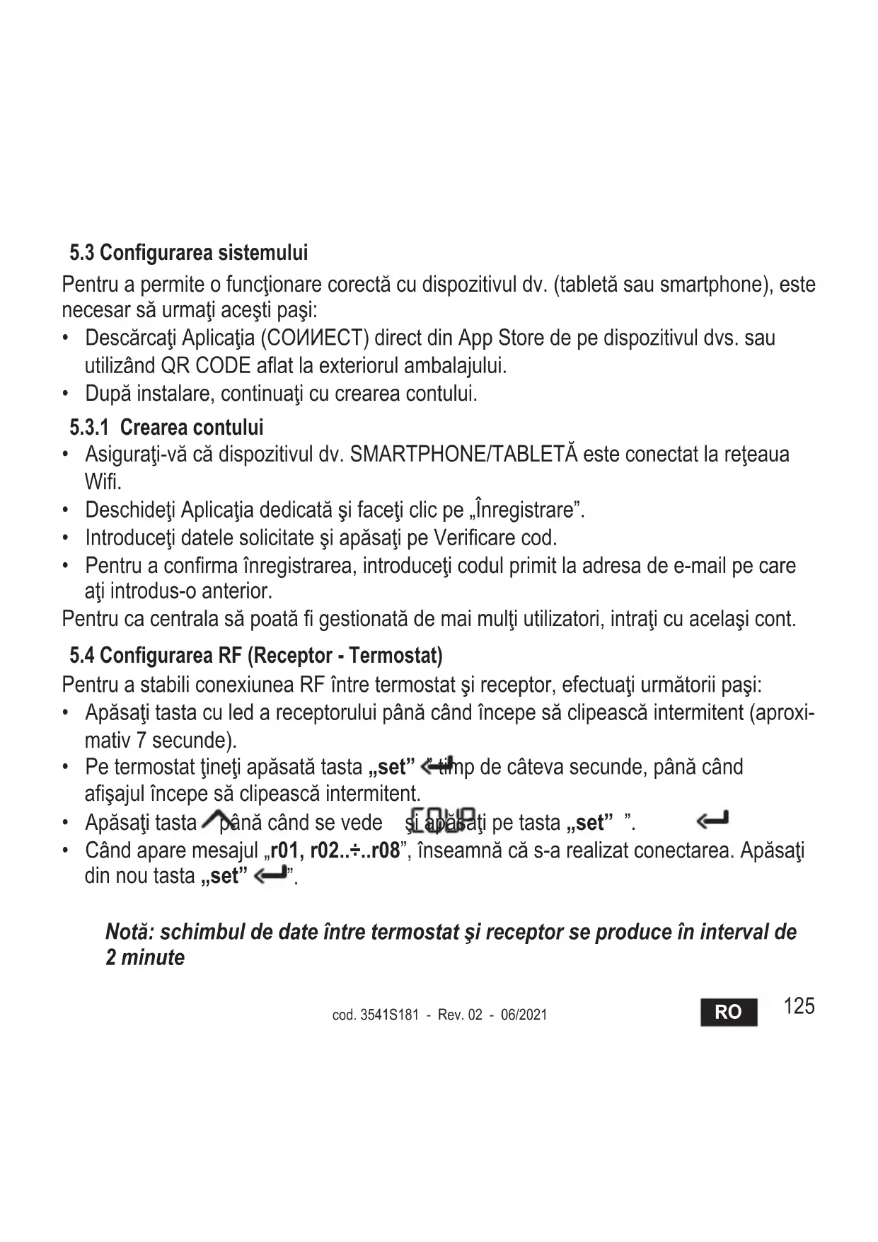 Notă: schimbul de date între termostat şi receptor se produce în interval de 2 minute126