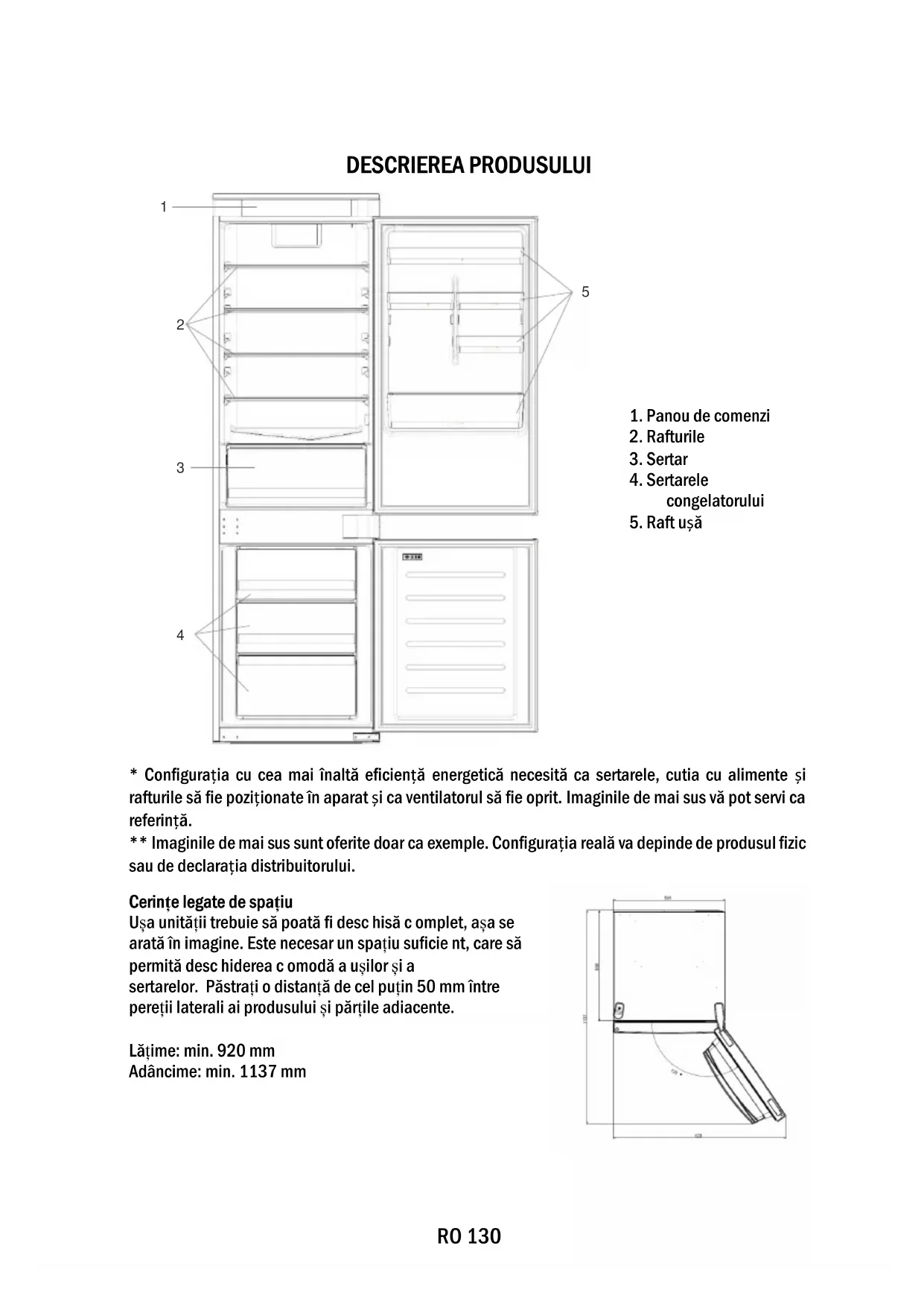 Cerințe legate de spațiu Ușa unității trebuie să poată fi desc hisă c omplet, așa se arată în imagine. Este nec esar un spațiu suficie nt, care să permită desc hiderea c omodă a ușilor și a sertarelor. Păstrați o distanță de cel puțin 50 mm între pereții laterali ai produsului și părțile adiacente. Lățime: min. 920 mm Adâncime: min. 1137 mmRO 131 UTILIZAREA A. Tasta ON/OFF, utilizată pentru pornirea/oprirea aparatului. B. Tasta Wi-Fi, utilizată pentru a porni/opri conexiunea Wi-Fi C. Tasta SET, utilizată pentru selectarea funcțiilor speciale (Eco și Vacanță) D. Tasta TEMP, utilizată pentru selectarea temperaturii frigiderului și a congelatorului a. Pictograma zonei frigiderului/congelatorului, arată ce compartiment al aparatului este selectat b. Nivelurile de temperatură a frigiderului indică temperatura selectată c. Pictograma Răcire rapidă indică dacă funcția Răcire rapidă este activată d. Nivelurile de temperatură a congelatorului indică temperatura selectată pentru congelator e. Pictograma Congelare rapidă indică dacă funcția Congelare rapidă este activată f. Pictograma temperatură particularizată afișează dacă temperatura a fost selectată de aplicație g. Pictograma Eco mode arată dacă modul Eco este activat h. Pictograma funcției Vacanță afișează dacă funcția Vacanță este activată