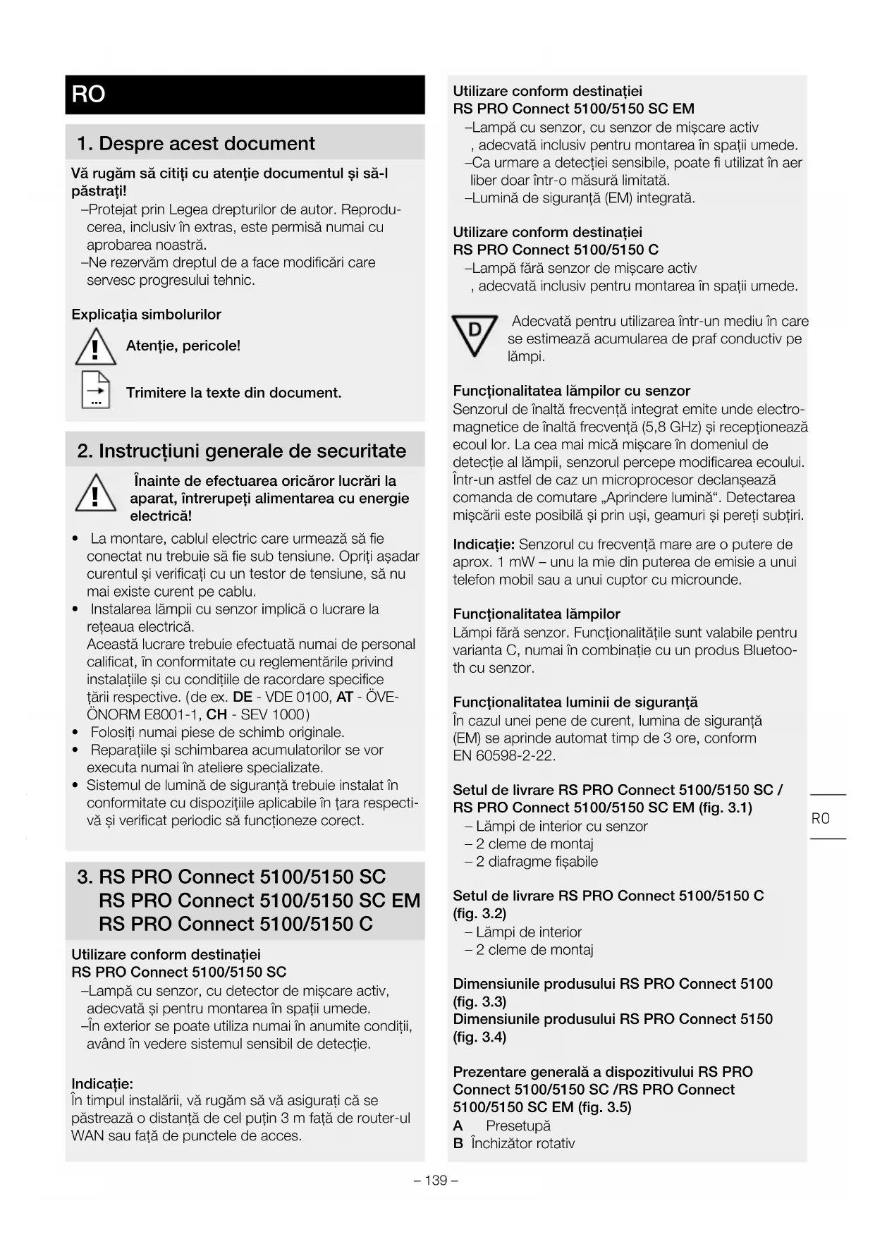 RS PRO Connect 5100/5150 SC EM RS PRO Connect 5100/5150 C Utilizare conform destinației RS PRO Connect 5100/5150 SC – Lampă cu senzor, cu detector de mişcare activ, adecvată şi pentru montarea în spaţii umede. – În exterior se poate utiliza numai în anumite condiţii, având în vedere sistemul sensibil de detecţie. Indicație: În timpul instalării, vă rugăm să vă asigurați că se păstrează o distanță de cel puțin 3 m față de router-ul WAN sau față de punctele de acces. Utilizare conform destinației RS PRO Connect 5100/5150 SC EM – Lampă cu senzor, cu senzor de mişcare activ , adecvată inclusiv pentru montarea în spații umede. – Ca urmare a detecției sensibile, poate fi utilizat în aer liber doar într-o măsură limitată. – Lumină de siguranță (EM) integrată. Utilizare conform destinației RS PRO Connect 5100/5150 C – Lampă fără senzor de mişcare activ , adecvată inclusiv pentru montarea în spații umede. Adecvată pentru utilizarea într-un mediu în care se estimează acumularea de praf conductiv pe lămpi. Funcționalitatea lămpilor cu senzor Senzorul de înaltă frecvenţă integrat emite unde electro- magnetice de înaltă frecvenţă (5,8 GHz) şi recepţionează ecoul lor. La cea mai mică mişcare în domeniul de detecţie al lămpii, senzorul percepe modificarea ecoului. Într-un astfel de caz un microprocesor declanşează comanda de comutare „Aprindere lumină“. Detectarea mişcării este posibilă şi prin uşi, geamuri şi pereţi subţiri. Indicaţie: Senzorul cu frecvenţă mare are o putere de aprox.1mW – unu la mie din puterea de emisie a unui telefon mobil sau a unui cuptor cu microunde. Funcționalitatea lămpilor Lămpi fără senzor. Funcționalitățile sunt valabile pentru varianta C, numai în combinație cu un produs Bluetoo- th cu senzor. Funcționalitatea luminii de siguranță În cazul unei pene de curent, lumina de siguranță (EM) se aprinde automat timp de 3 ore, conform EN 60598-2-22. Setul de livrare RS PRO Connect 5100/5150 SC / RS PRO Connect 5100/5150 SC EM (fig. 3.1) – Lămpi de interior cu senzor – 2 cleme de montaj – 2 diafragme fişabile Setul de livrare RS PRO Connect 5100/5150 C (fig. 3.2) – Lămpi de interior – 2 cleme de montaj Dimensiunile produsului RS PRO Connect 5100 (fig. 3.3) Dimensiunile produsului RS PRO Connect 5150 (fig. 3.4) Prezentare generală a dispozitivului RS PRO Connect 5100/5150 SC /RS PRO Connect 5100/5150 SC EM (fig. 3.5) A Presetupă B Închizător rotativ RO– 140 – C Bornă de conexiune D Clemă de montaj E Capace F Carcasă lampă G Senzor HF H Diafragmă fişabilă Prezentare generală a dispozitivului RS PRO Connect 5100/5150 C (fig. 3.6) A Garnitură de cablu cu şurub B Încuietoare rotativă C Bornă de racord D Clemă de montaj E Capace de capăt F Carcasa lămpii Zone de detecție la montarea în plafon Ø 1-10m (fig. 3.7) Zone de detecție la montarea pe perete Ø 1-10m (fig. 3.8) Distribuirea intensității luminoase (fig. 3.9 - 3.14)