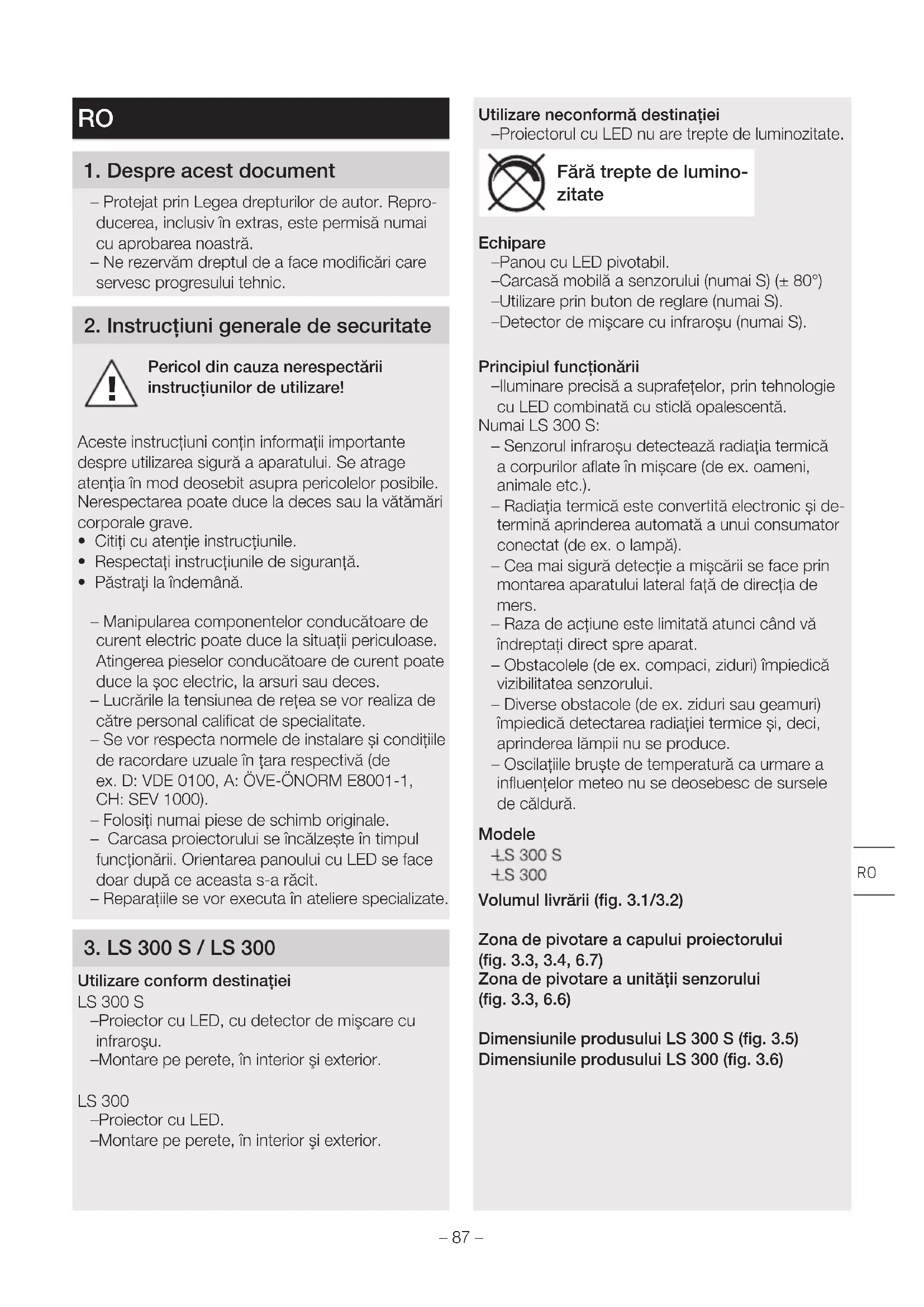 Utilizare conform destinaţiei LS300S – Proiector cu LED, cu detector de mişcare cu infraroşu. – Montare pe perete, în interior şi exterior. LS300 – Proiector cu LED. – Montare pe perete, în interior şi exterior. Utilizare neconformă destinaţiei – Proiectorul cu LED nu are trepte de luminozitate. Fără trepte de lumino- zitate Echipare – Panou cu LED pivotabil. – Carcasă mobilă a senzorului (numai S) (± 80°) – Utilizare prin buton de reglare (numai S). – Detector de mişcare cu infraroşu (numai S). Principiul funcţionării – Iluminare precisă a suprafeţelor, prin tehnologie cu LED combinată cu sticlă opalescentă. Numai LS 300 S: – Senzorul infraroșu detectează radiaţia termică a corpurilor aflate în mișcare (de ex. oameni, animale etc.). – Radiaţia termică este convertită electronic și de- termină aprinderea automată a unui consumator conectat (de ex. o lampă). – Cea mai sigură detecţie a mișcării se face prin montarea aparatului lateral faţă de direcţia de mers. – Raza de acţiune este limitată atunci când vă îndreptaţi direct spre aparat. – Obstacolele (de ex. compaci, ziduri) împiedică vizibilitatea senzorului. – Diverse obstacole (de ex. ziduri sau geamuri) împiedică detectarea radiaţiei termice și, deci, aprinderea lămpii nu se produce. – Oscilaţiile bruște de temperatură ca urmare a influenţelor meteo nu se deosebesc de sursele de căldură. Modele