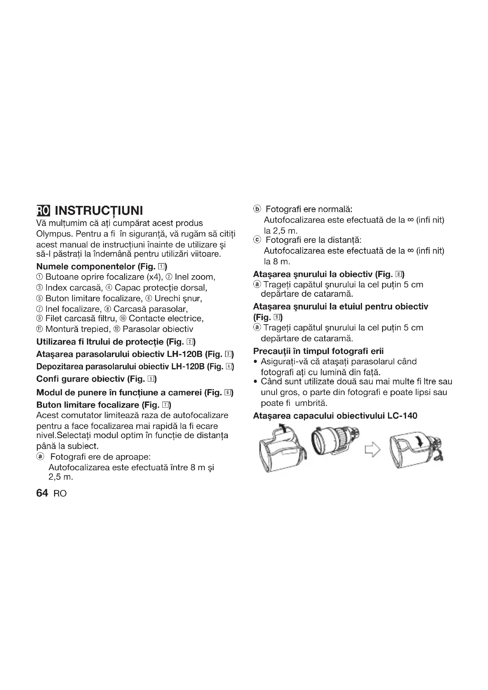 - 64 RO INSTRUCŢIUNI Vă mulţumim că aţi cumpărat acest produs Olympus. Pentru a fi în siguranţă, vă rugăm să citiţi acest manual de instrucţiuni înainte de utilizare şi să-l păstraţi la îndemână pentru utilizări viitoare. Numele componentelor (Fig. 1) 1 Butoane oprire focalizare (x4), 2 Inel zoom, 3 Index carcasă, 4 Capac protecţie dorsal, 5 Buton limitare focalizare, 6 Urechi şnur, 7 Inel focalizare, 8 Carcasă parasolar, 9 Filet carcasă fi ltru, 0 Contacte electrice, q Montură trepied, w Parasolar obiectiv Utilizarea fi ltrului de protecţie (Fig. 2) Ataşarea parasolarului obiectiv LH-120B (Fig. 3) Depozitarea parasolarului obiectiv LH-120B (Fig. 4) Confi gurare obiectiv (Fig. 5) Modul de punere în funcţiune a camerei (Fig. 6) Buton limitare focalizare (Fig. 7) Acest comutator limitează raza de autofocalizare pentru a face focalizarea mai rapidă la fi ecare nivel.Selectaţi modul optim în funcţie de distanţa până la subiect.