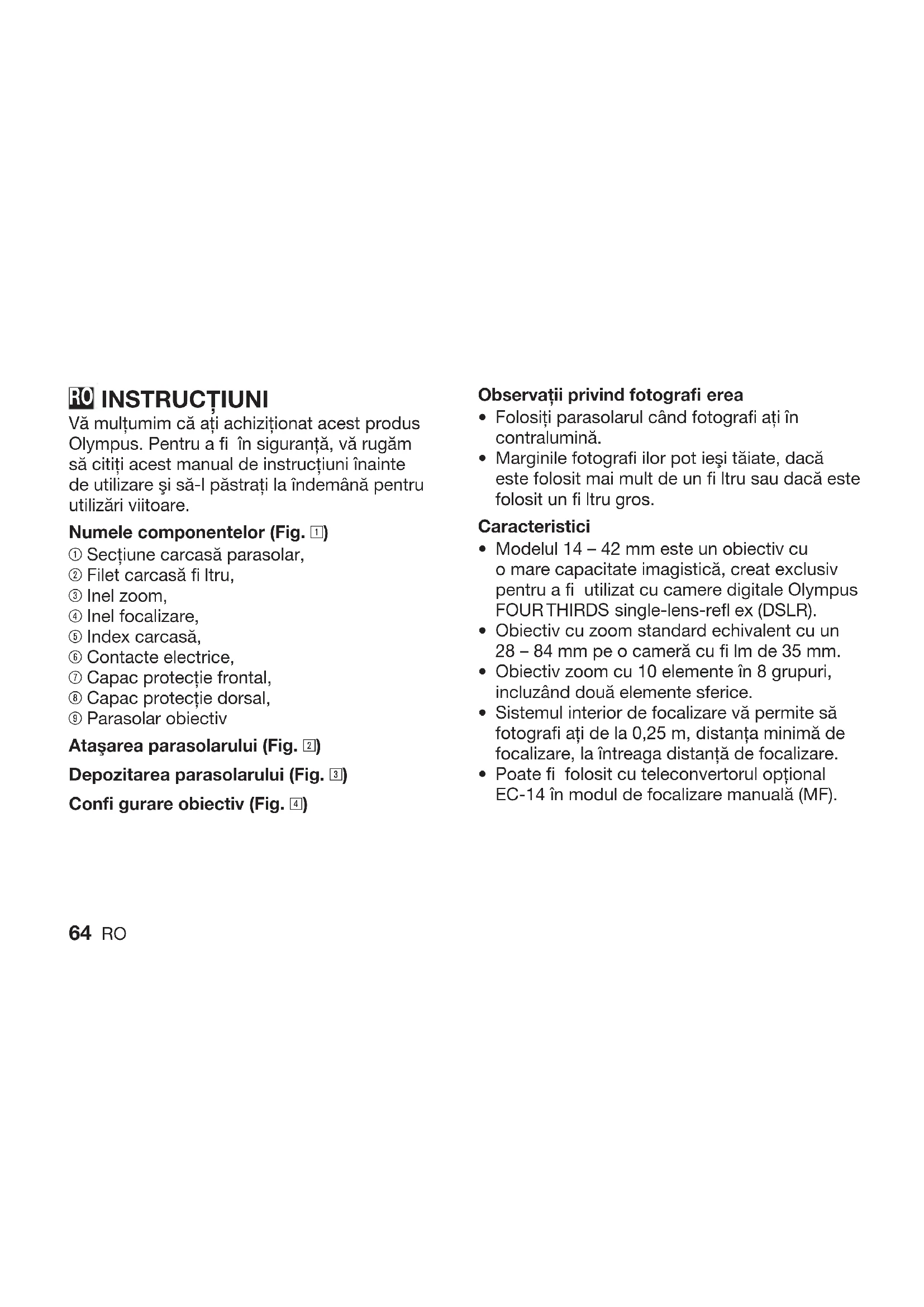 - 64 RO INSTRUCŢIUNI Vă mulţumim că aţi achiziţionat acest produs Olympus. Pentru a fi în siguranţă, vă rugăm să citiţi acest manual de instrucţiuni înainte de utilizare şi să-l păstraţi la îndemână pentru utilizări viitoare. Numele componentelor (Fig. 1) 1 Secţiune carcasă parasolar, 2 Filet carcasă fi ltru, 3 Inel zoom, 4 Inel focalizare, 5 Index carcasă, 6 Contacte electrice, 7 Capac protecţie frontal, 8 Capac protecţie dorsal, 9 Parasolar obiectiv Ataşarea parasolarului (Fig. 2) Depozitarea parasolarului (Fig. 3) Confi gurare obiectiv (Fig. 4) Observaţii privind fotografi erea Folosiţi parasolarul când fotografi aţi în contralumină. Marginile fotografi ilor pot ieşi tăiate, dacă este folosit mai mult de un fi ltru sau dacă este folosit un fi ltru gros. Caracteristici Modelul 14 – 42 mm este un obiectiv cu o mare capacitate imagistică, creat exclusiv pentru a fi utilizat cu camere digitale Olympus FOUR THIRDS single-lens-refl ex (DSLR). Obiectiv cu zoom standard echivalent cu un 28 – 84 mm pe o cameră cu fi lm de 35 mm. Obiectiv zoom cu 10 elemente în 8 grupuri, incluzând două elemente sferice. Sistemul interior de focalizare vă permite să fotografi aţi de la 0,25 m, distanţa minimă de focalizare, la întreaga distanţă de focalizare. Poate fi folosit cu teleconvertorul opţional EC-14 în modul de focalizare manuală (MF).