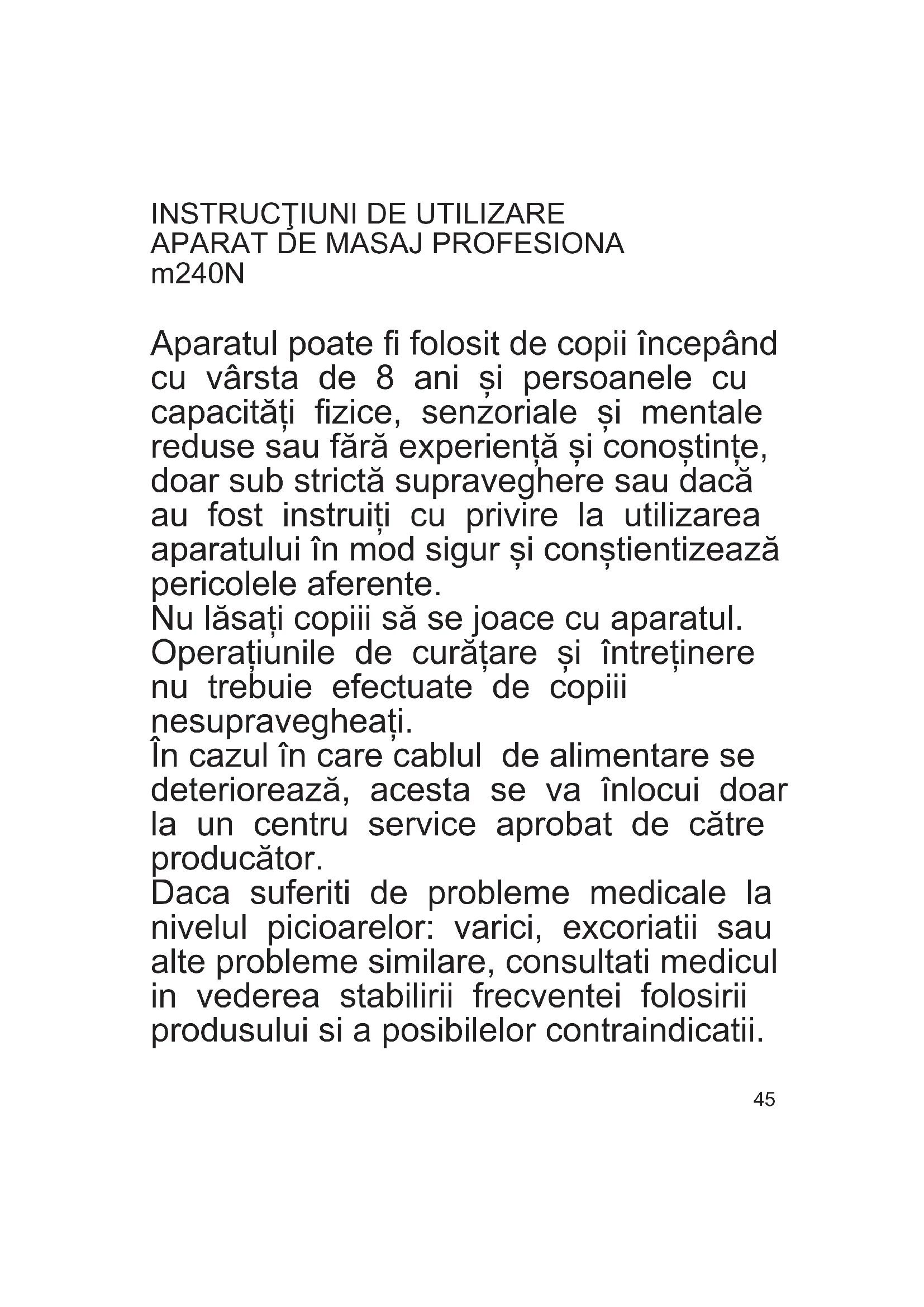 C45 Aparatul poate folosit de copii începând cu vârsta de 8 ani și persoanele cu capacități zice, senzoriale și mentale reduse sau fără experiență și conoștințe, doar sub strictă supraveghere sau dacă au fost instruiți cu privire la utilizarea aparatului în mod sigur și conștientizează pericolele aferente. Nu lăsați copiii să se joace cu aparatul. Operațiunile de curățare și întreținere nu trebuie efectuate de copiii nesupravegheați. În cazul în care cablul de alimentare se deteriorează, acesta se va înlocui doar la un centru service aprobat de către producător. Daca suferiti de probleme medicale la nivelul picioarelor: varici, excoriatii sau alte probleme similare, consultati medicul in vederea stabilirii frecventei folosirii produsului si a posibilelor contraindicatii.