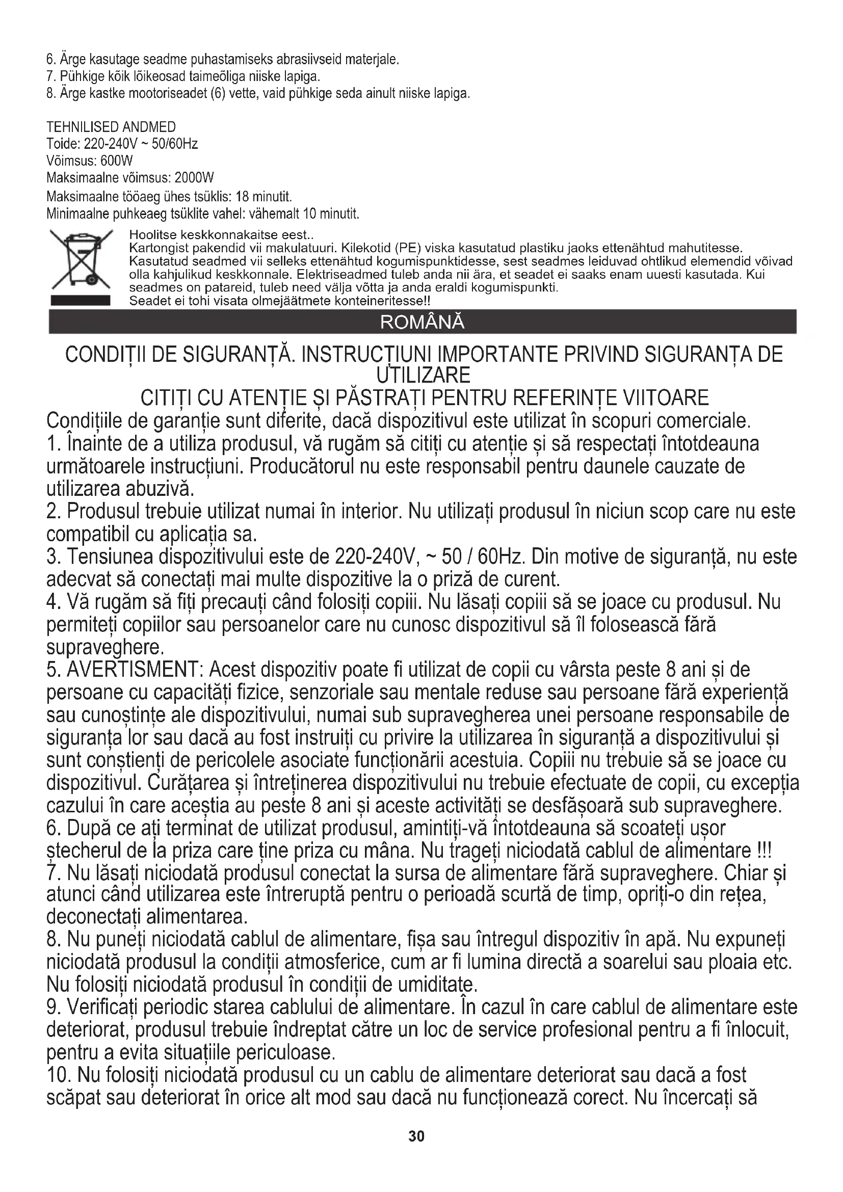 DATE TEHNICE Alimentare: 220-240V ~ 50 / 60Hz Putere: 600W Putere maxima: 2000W Timp maxim de funcționare într-un singur ciclu: 18 minute. Timp minim de odihnă între cicluri: cel puțin 10 minute. Din grija pentru mediul înconjurător. Ambalajele din carton vă rugăm să le transmiteţi şa centrele de maculatură. Sacii din polietilenă (PE) trebuie aruncate în recipientele pentru materialele plastice. Dispozitivul uzat trebuie transmis la punctul corespunzător de depozitare, deoarece componentele periculoase care se găsesc în dispozitiv pot fi foarte periculoase pentru mediul înconjurător. Dispozitivul electric trebuie transmis în aşa fel încât să se limiteze utilizarea lui repetată. Dacă în dispozitiv se găsesc baterii acestea trebuiesc scoase şi transmise către punctul de depozitare a acestora, separat. BOSANSKI SIGURNOSNI USLOVI. VAŽNE UPUTE O SIGURNOSTI KORIŠTENJA PAŽLJIVO PROČITAJTE I ČUVAJTE ZA BUDUĆU REFERENCU Garancijski uvjeti su različiti ako se uređaj koristi u komercijalne svrhe.