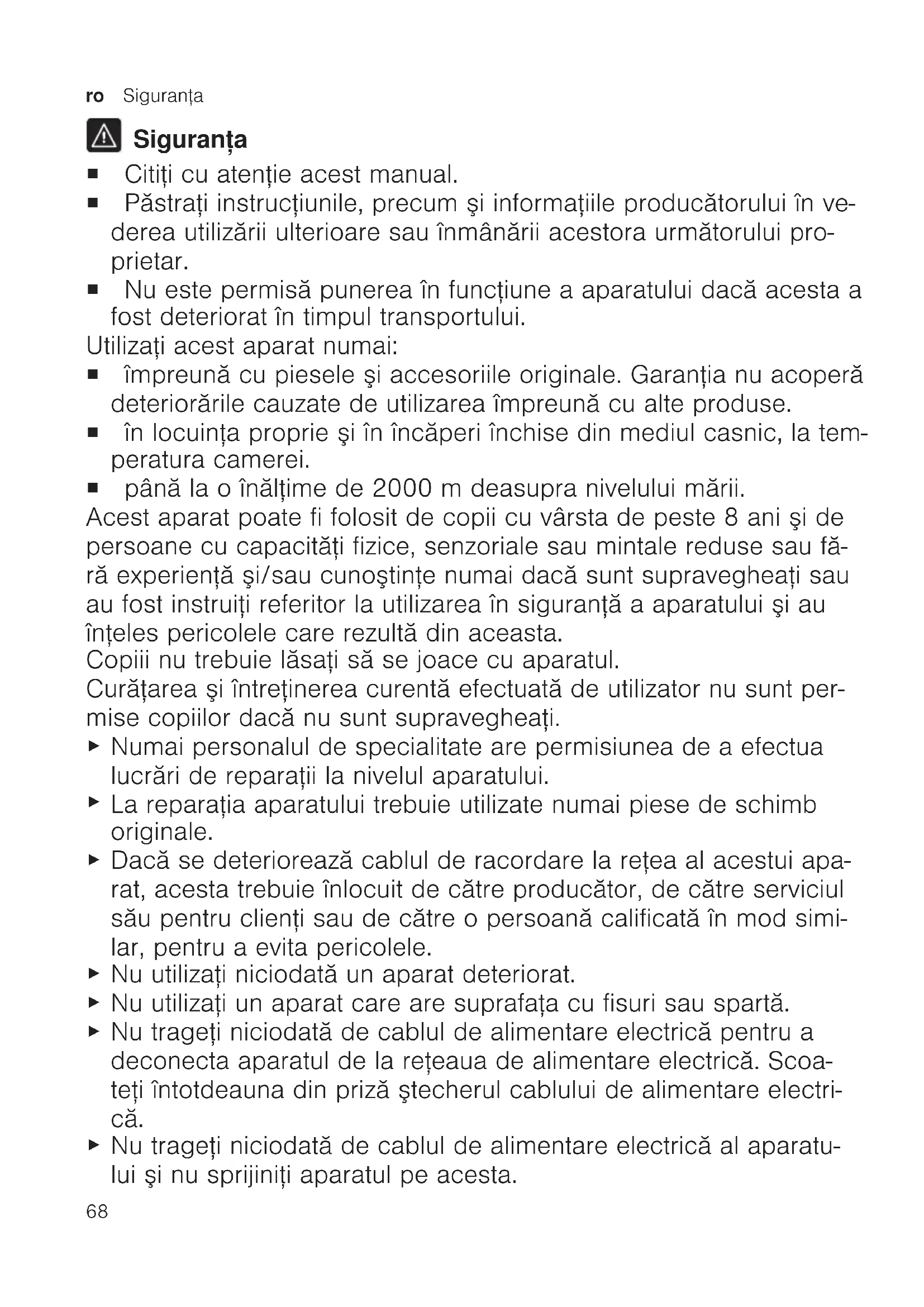 Siguranţa ¡ Citiţi cu atenţie acest manual. ¡ Păstraţi instrucţiunile, precum şi informaţiile producătorului în ve- derea utilizării ulterioare sau înmânării acestora următorului pro- prietar. ¡ Nu este permisă punerea în funcţiune a aparatului dacă acesta a fost deteriorat în timpul transportului. Utilizaţi acest aparat numai: ¡ împreună cu piesele şi accesoriile originale. Garanţia nu acoperă deteriorările cauzate de utilizarea împreună cu alte produse. ¡ în locuinţa proprie şi în încăperi închise din mediul casnic, la tem- peratura camerei. ¡ până la o înălţime de 2000m deasupra nivelului mării. Acest aparat poate fi folosit de copii cu vârsta de peste 8 ani şi de persoane cu capacităţi fizice, senzoriale sau mintale reduse sau fă- ră experienţă şi/sau cunoştinţe numai dacă sunt supravegheaţi sau au fost instruiţi referitor la utilizarea în siguranţă a aparatului şi au înţeles pericolele care rezultă din aceasta. Copiii nu trebuie lăsaţi să se joace cu aparatul. Curăţarea şi întreţinerea curentă efectuată de utilizator nu sunt per- mise copiilor dacă nu sunt supravegheaţi.