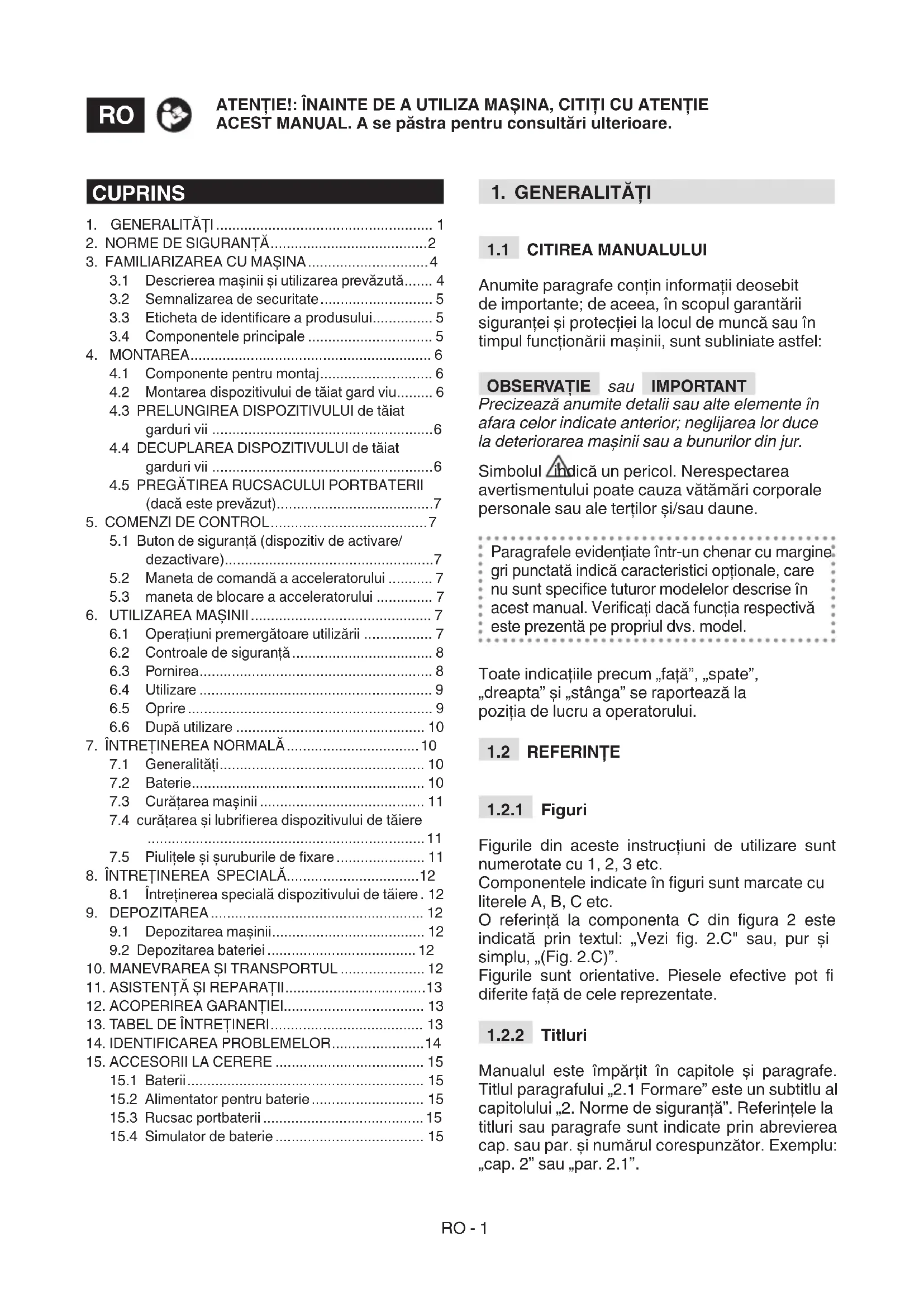 Manualul este împărțit în capitole și paragrafe. Titlul paragrafului „2.1 Formare” este un subtitlu al capitolului „2. Norme de siguranță”. Referințele la titluri sau paragrafe sunt indicate prin abrevierea cap. sau par. și numărul corespunzător. Exemplu: „cap. 2” sau „par. 2.1”. CUPRINS