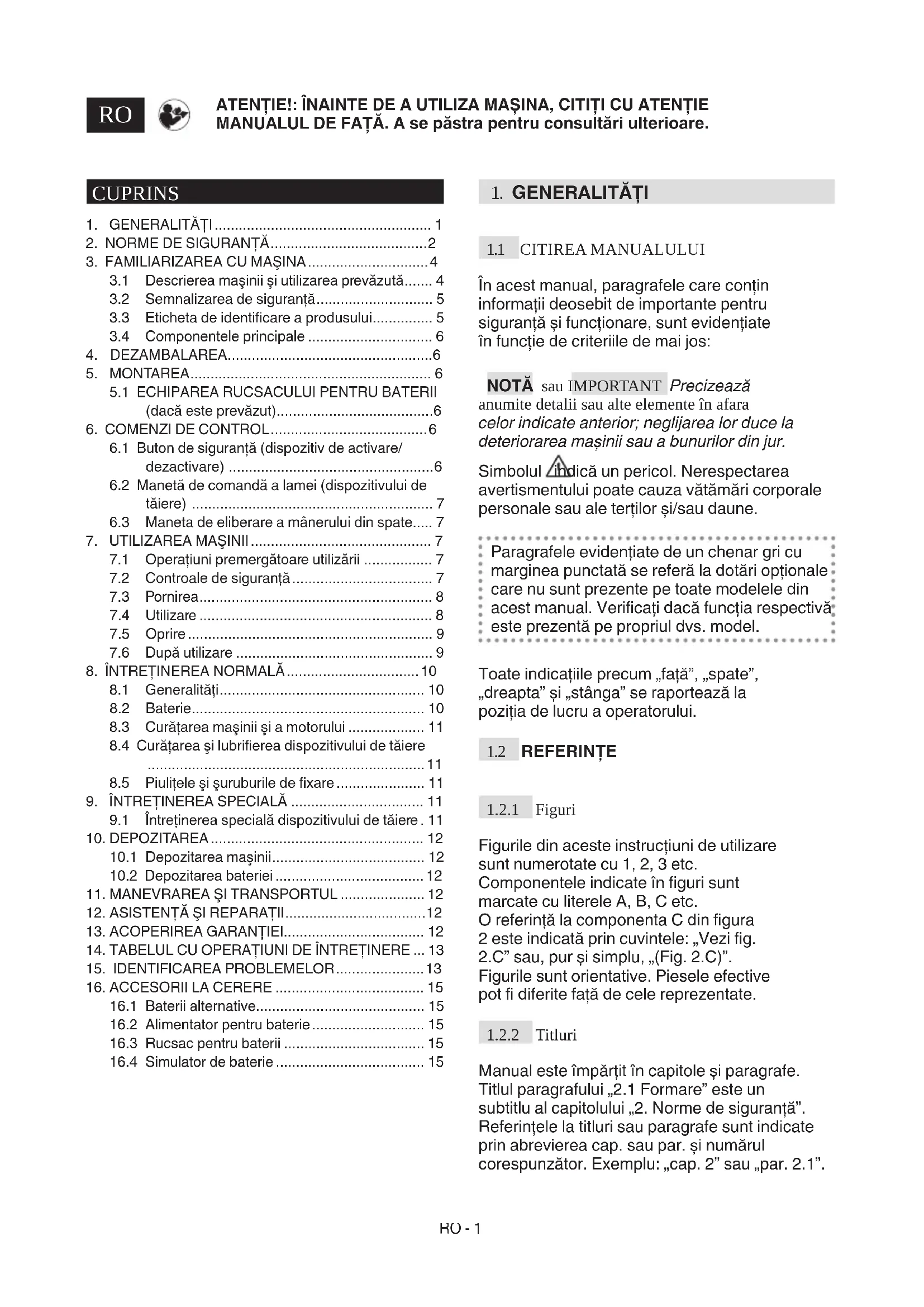 Manual este împărţit în capitole și paragrafe. Titlul paragrafului „2.1 Formare” este un subtitlu al capitolului „2. Norme de siguranţă”. Referinţele la titluri sau paragrafe sunt indicate prin abrevierea cap. sau par. și numărul corespunzător. Exemplu: „cap. 2” sau „par. 2.1”. CUPRINS
