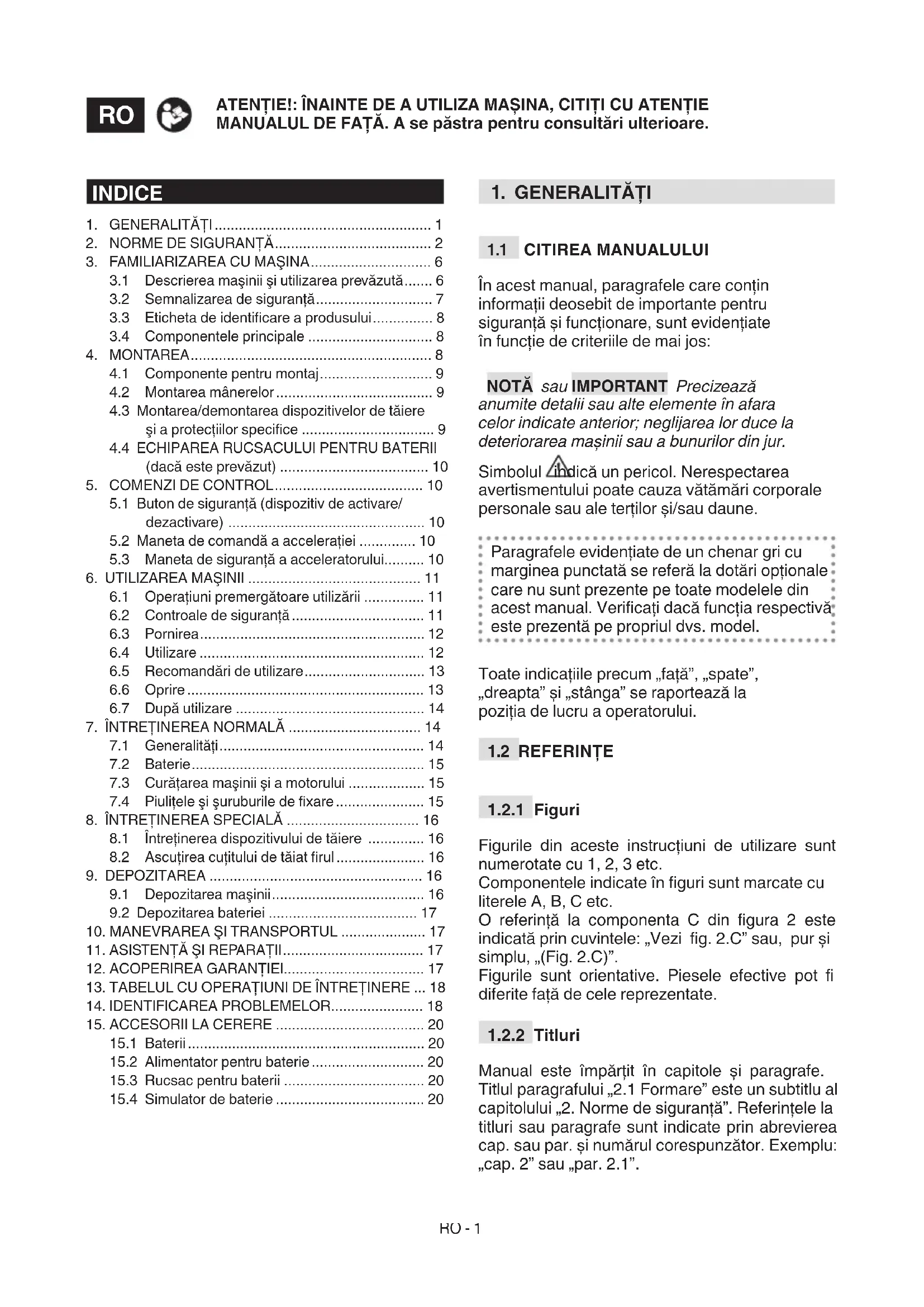 IMPORTANT Următoarele norme de siguranță cuprind indicațiile de siguranță din manualul specic al bateriei şi al încărcătorului de baterie, anexat maşinii.