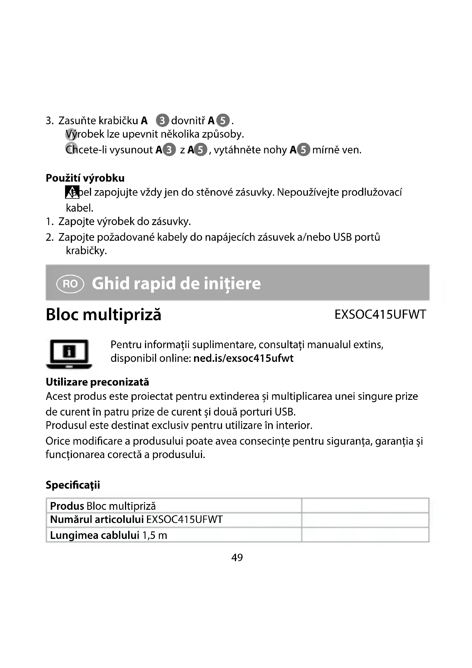 Ghid rapid de inițiere Bloc multipriză EXSOC415UFWT Pentru informații suplimentare, consultați manualul extins, disponibil online: ned.is/exsoc415ufwt Utilizare preconizată Acest produs este proiectat pentru extinderea și multiplicarea unei singure prize de curent în patru prize de curent și două porturi USB. Produsul este destinat exclusiv pentru utilizare în interior. Orice modicare a produsului poate avea consecințe pentru siguranța, garanția și funcționarea corectă a produsului. Specicaţii Produs Bloc multipriză Numărul articolului EXSOC415UFWT Lungimea cablului 1,5 m50 Specicații (Prize electrice) Energie electrică de intrare 250 V / 16 A Clasa electrică I Putere nominală Max. 3680 W Clasicare IP IP20 Specicații (Porturi USB) Energie electrică de intrare 230 V ~ 50 Hz Tensiune de ieșire 5 A Curent de ieșire 2,1 V Putere de ieșire 10,5 W Eciență medie de funcționare 79,19 % Eciența la sarcină mică (10%) 73,76 % Consum electric fără sarcină 0,08 W Piese principale (imagine A) 1 Priză de alimentare 2 Porturi USB 3 Cutie 4 Ștecher 5 Suport de montare 6 Placă de montare 7 Șurub Instrucțiuni de siguranță
