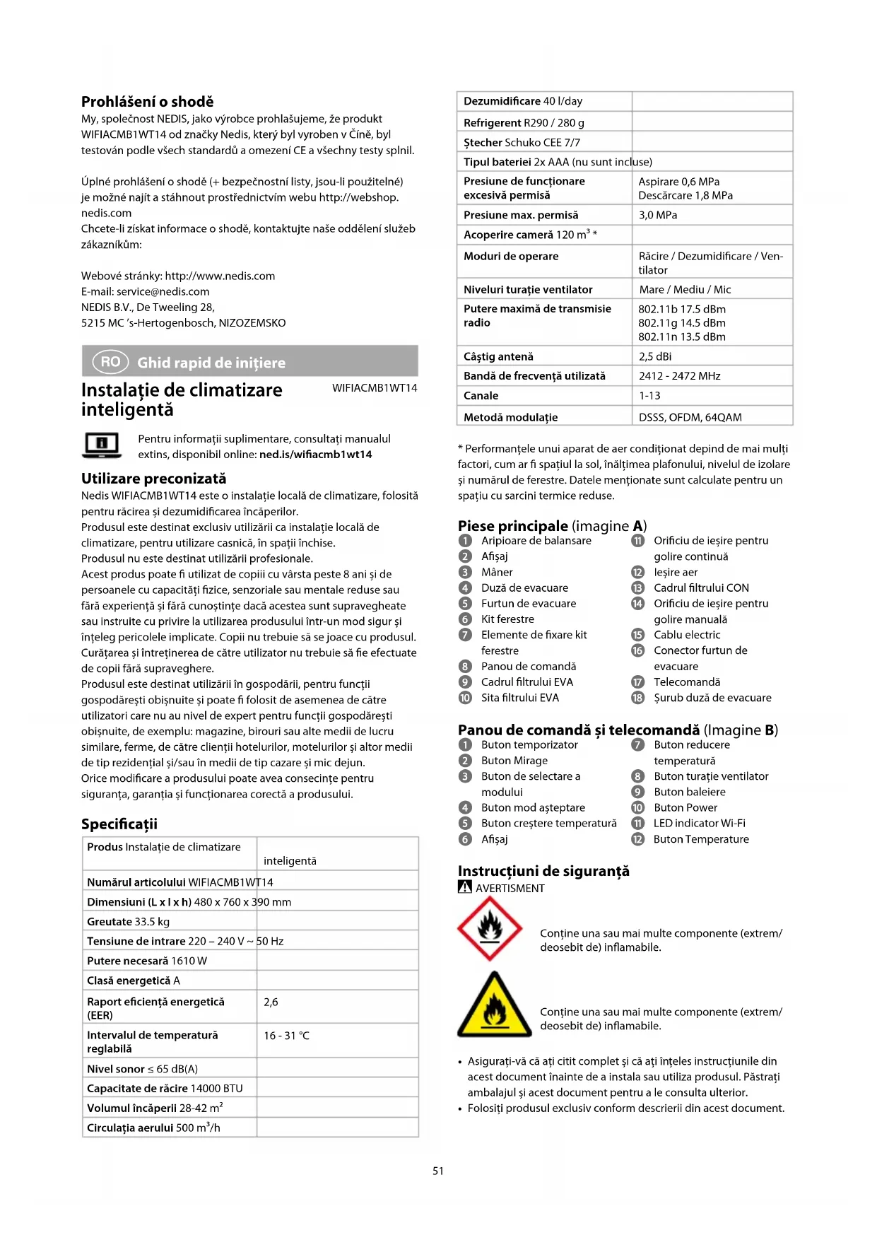 Ghid rapid de inițiere Instalație de climatizare inteligentă WIFIACMB1WT14Pentru informații suplimentare, consultați manualul extins, disponibil online: ned.is/wiacmb1wt14 Utilizare preconizată Nedis WIFIACMB1WT14 este o instalație locală de climatizare, folosită pentru răcirea și dezumidicarea încăperilor.Produsul este destinat exclusiv utilizării ca instalație locală de climatizare, pentru utilizare casnică, în spații închise.Produsul nu este destinat utilizării profesionale.Acest produs poate utilizat de copiii cu vârsta peste 8 ani și de persoanele cu capacități zice, senzoriale sau mentale reduse sau fără experiență și fără cunoștințe dacă acestea sunt supravegheate sau instruite cu privire la utilizarea produsului într-un mod sigur și înțeleg pericolele implicate. Copii nu trebuie să se joace cu produsul. Curățarea și întreținerea de către utilizator nu trebuie să e efectuate de copii fără supraveghere.Produsul este destinat utilizării în gospodării, pentru funcții gospodărești obișnuite și poate folosit de asemenea de către utilizatori care nu au nivel de expert pentru funcții gospodărești obișnuite, de exemplu: magazine, birouri sau alte medii de lucru similare, ferme, de către clienții hotelurilor, motelurilor și altor medii de tip rezidențial și/sau în medii de tip cazare și mic dejun.Orice modicare a produsului poate avea consecințe pentru siguranța, garanția și funcționarea corectă a produsului. Specicaţii Produs Instalație de climatizare inteligentăNumărul articolului WIFIACMB1WT14Dimensiuni (L x l x h) 480 x 760 x 390 mmGreutate 33.5 kgTensiune de intrare 220 – 240 V ~ 50 HzPutere necesară 1610 WClasă energetică ARaport eciență energetică (EER) 2,6 Intervalul de temperatură reglabilă16 - 31 °CNivel sonor ≤ 65 dB(A)Capacitate de răcire 14000 BTUVolumul încăperii 28-42 m²Circulația aerului 500 m³/hDezumidicare 40 l/dayRefrigerent R290 / 280 gȘtecher Schuko CEE 7/7Tipul bateriei 2x AAA (nu sunt incluse)Presiune de funcționare excesivă permisăAspirare 0,6 MPaDescărcare 1,8 MPaPresiune max. permisă 3,0 MPaAcoperire cameră 120 m³ *Moduri de operare Răcire/Dezumidicare/Ven-tilatorNiveluri turație ventilator Mare/Mediu/MicPutere maximă de transmisie radio802.11b 17.5 dBm802.11g 14.5 dBm802.11n 13.5 dBmCâștig antenă 2,5 dBiBandă de frecvență utilizată 2412 - 2472 MHzCanale 1-13Metodă modulație DSSS, OFDM, 64QAM* Performanțele unui aparat de aer condiționat depind de mai mulți factori, cum ar spațiul la sol, înălțimea plafonului, nivelul de izolare și numărul de ferestre. Datele menționate sunt calculate pentru un spațiu cu sarcini termice reduse. Piese principale (imagine A) 1 Aripioare de balansare 2 Așaj 3 Mâner 4 Duză de evacuare 5 Furtun de evacuare 6 Kit ferestre 7 Elemente de xare kit ferestre 8 Panou de comandă 9 Cadrul ltrului EVA q Sita ltrului EVA w Oriciu de ieșire pentru golire continuă e Ieșire aer r Cadrul ltrului CON t Oriciu de ieșire pentru golire manuală y Cablu electric u Conector furtun de evacuare i Telecomandă o Șurub duză de evacuare Panou de comandă și telecomandă (Imagine B) 1 Buton temporizator 2 Buton Mirage 3 Buton de selectare a modului 4 Buton mod așteptare 5 Buton creștere temperatură 6 Așaj 7 Buton reducere temperatură 8 Buton turație ventilator 9 Buton baleiere q Buton Power w LED indicator Wi-Fi e Buton Temperature Instrucțiuni de siguranță