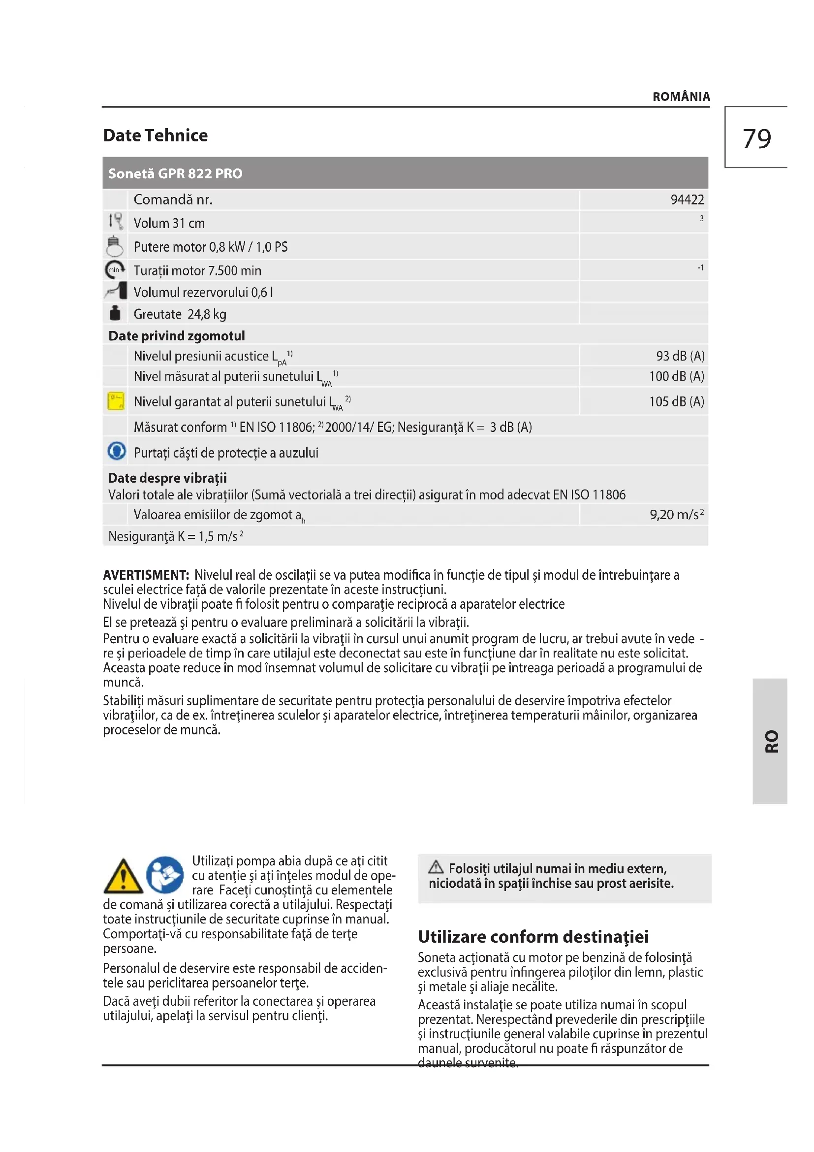 tele sau periclitarea persoanelor terţe. Dacă aveţi dubii referitor la conectarea şi operarea utilajului, apelaţi la servisul pentru clienţi. Folosiţi utilajul numai în mediu extern, niciodată în spaţii închise sau prost aerisite. Utilizare conform destinaţiei Soneta acţionată cu motor pe benzină de folosinţă exclusivă pentru înngerea piloţilor din lemn, plastic şi metale şi aliaje necălite. Această instalaţie se poate utiliza numai în scopul prezentat. Nerespectând prevederile din prescripţiile şi instrucţiunile general valabile cuprinse în prezentul manual, producătorul nu poate răspunzător de daunele survenite. RO80