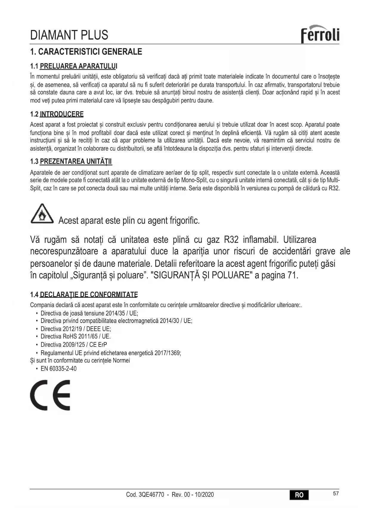 Compania declară că acest aparat este în conformitate cu cerințele următoarelor directive și modificărilor ulterioare:.• Directiva de joasă tensiune 2014/35 / UE;• Directiva privind compatibilitatea electromagnetică 2014/30 / UE;• Directiva 2012/19 / DEEE UE;• Directiva RoHS 2011/65 / UE.• Directiva 2009/125 / CE ErP• Regulamentul UE privind etichetarea energetică 2017/1369;Și sunt în conformitate cu cerințele Normei• EN 60335-2-40RO Cod. 3QE46770 - Rev. 00 - 10/2020 DIAMANT PLUS