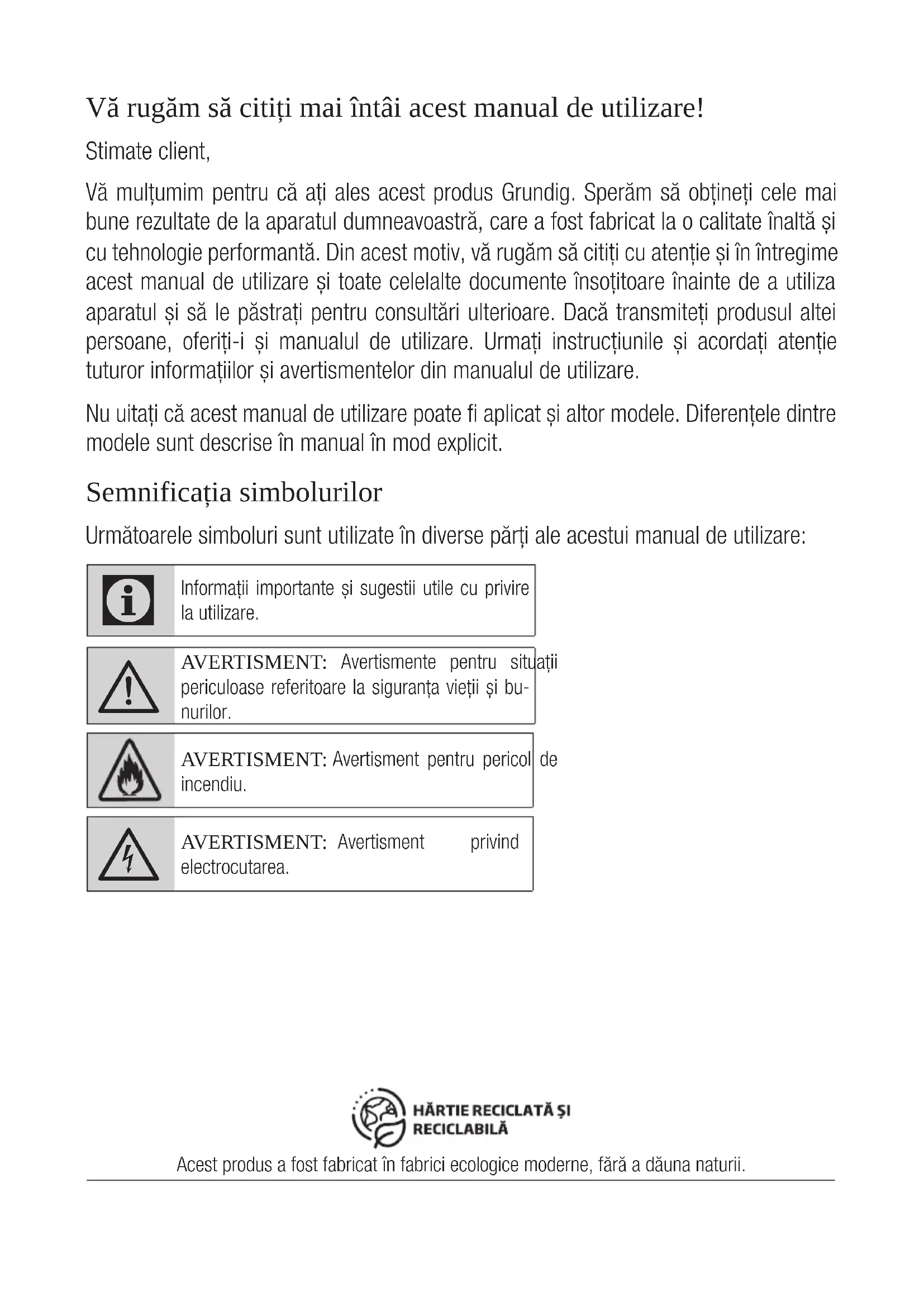 - Produsele de la Grundig sunt conforme standardelor de sigu- ranță aplicabile; din acest motiv, în caz de defecțiune a produsu- lui sau a cablului de alimentare, acestea trebuie reparate sau în- locuite de distribuitor, un centru de service sau un service similar specializat și autorizat, pentru evitarea oricărui pericol. Lucrările de reparații greșite sau efectu- ate de persoane necalificate pot cauza pericole sau riscuri utiliza- torului.