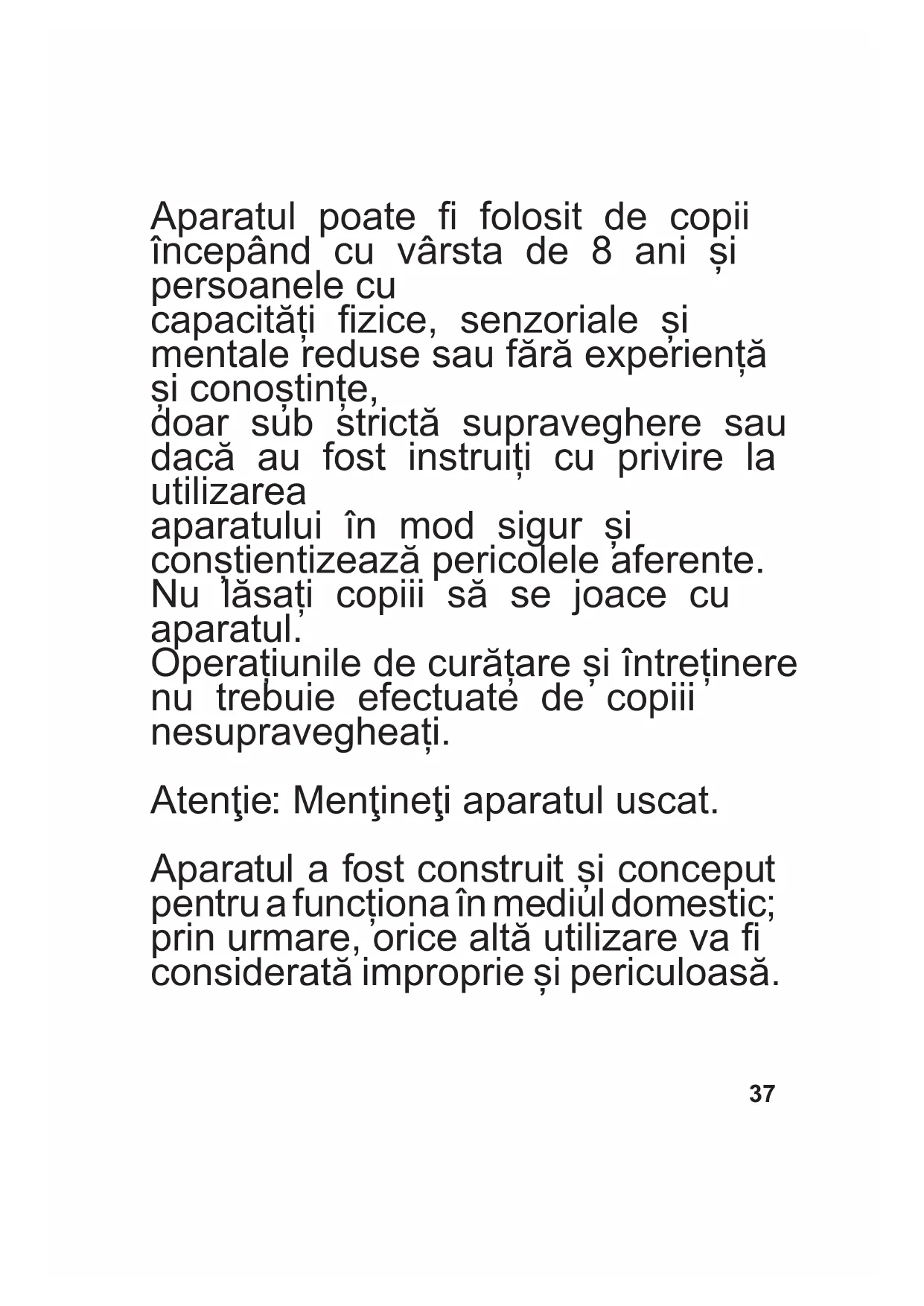 Aparatul poate folosit de copii începând cu vârsta de 8 ani și persoanele cu capacități zice, senzoriale și mentale reduse sau fără experiență și conoștințe, doar sub strictă supraveghere sau dacă au fost instruiți cu privire la utilizarea aparatului în mod sigur și conștientizează pericolele aferente. Nu lăsați copiii să se joace cu aparatul. Operațiunile de curățare și întreținere nu trebuie efectuate de copiii nesupravegheați. Atenţie: Menţineţi aparatul uscat. Aparatul a fost construit și conceput pentru a funcționa în mediul domestic; prin urmare, orice altă utilizare va considerată improprie și periculoasă.Averitizari