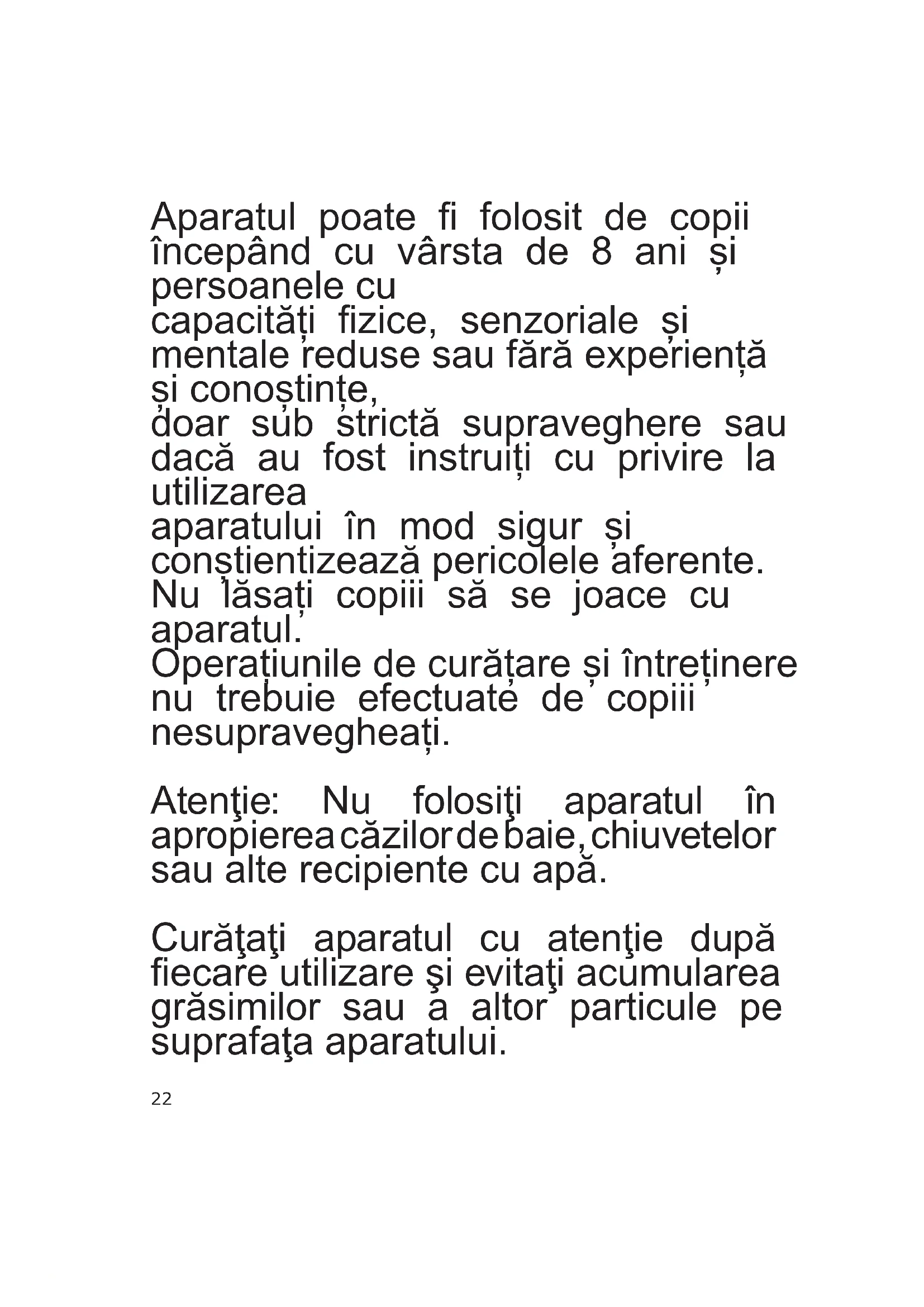 Aparatul poate folosit de copii începând cu vârsta de 8 ani și persoanele cu capacități zice, senzoriale și mentale reduse sau fără experiență și conoștințe, doar sub strictă supraveghere sau dacă au fost instruiți cu privire la utilizarea aparatului în mod sigur și conștientizează pericolele aferente. Nu lăsați copiii să se joace cu aparatul. Operațiunile de curățare și întreținere nu trebuie efectuate de copiii nesupravegheați. Atenţie: Nu folosiţi aparatul în apropierea căzilor de baie, chiuvetelor sau alte recipiente cu apă. Curăţaţi aparatul cu atenţie după ecare utilizare şi evitaţi acumularea grăsimilor sau a altor particule pe suprafaţa aparatului.23 Introducere