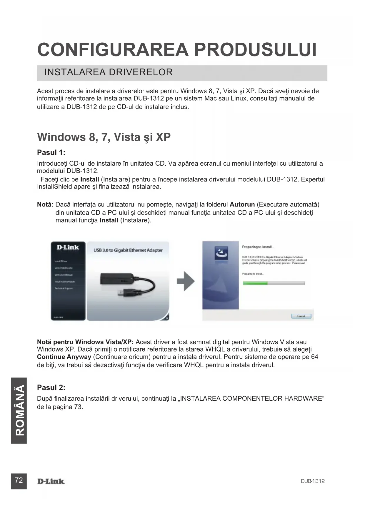 ROMÂNĂ CONFIGURAREA PRODUSULUI Acest proces de instalare a driverelor este pentru Windows 8, 7, Vista şi XP. Dacă aveţi nevoie de informaţii referitoare la instalarea DUB-1312 pe un sistem Mac sau Linux, consultaţi manualul de utilizare a DUB-1312 de pe CD-ul de instalare inclus. Pasul 1: Introduceţi CD-ul de instalare în unitatea CD. Va apărea ecranul cu meniul interfeţei cu utilizatorul a modelului DUB-1312. Faceţi clic pe Install (Instalare) pentru a începe instalarea driverului modelului DUB-1312. Expertul InstallShield apare şi nalizează instalarea. Notă: Dacă interfaţa cu utilizatorul nu porneşte, navigaţi la folderul Autorun (Executare automată) din unitatea CD a PC-ului şi deschideţi manual funcţia unitatea CD a PC-ului şi deschideţi manual funcţia Install (Instalare). Pasul 2: După nalizarea instalării driverului, continuaţi la „INSTALAREA COMPONENTELOR HARDWARE” de la pagina 73. Windows 8, 7, Vista şi XP INSTALAREA DRIVERELOR Notă pentru Windows Vista/XP: Acest driver a fost semnat digital pentru Windows Vista sau Windows XP. Dacă primiţi o noticare referitoare la starea WHQL a driverului, trebuie să alegeţi Continue Anyway (Continuare oricum) pentru a instala driverul. Pentru sisteme de operare pe 64 de biţi, va trebui să dezactivaţi funcţia de vericare WHQL pentru a instala driverul.DUB-1312