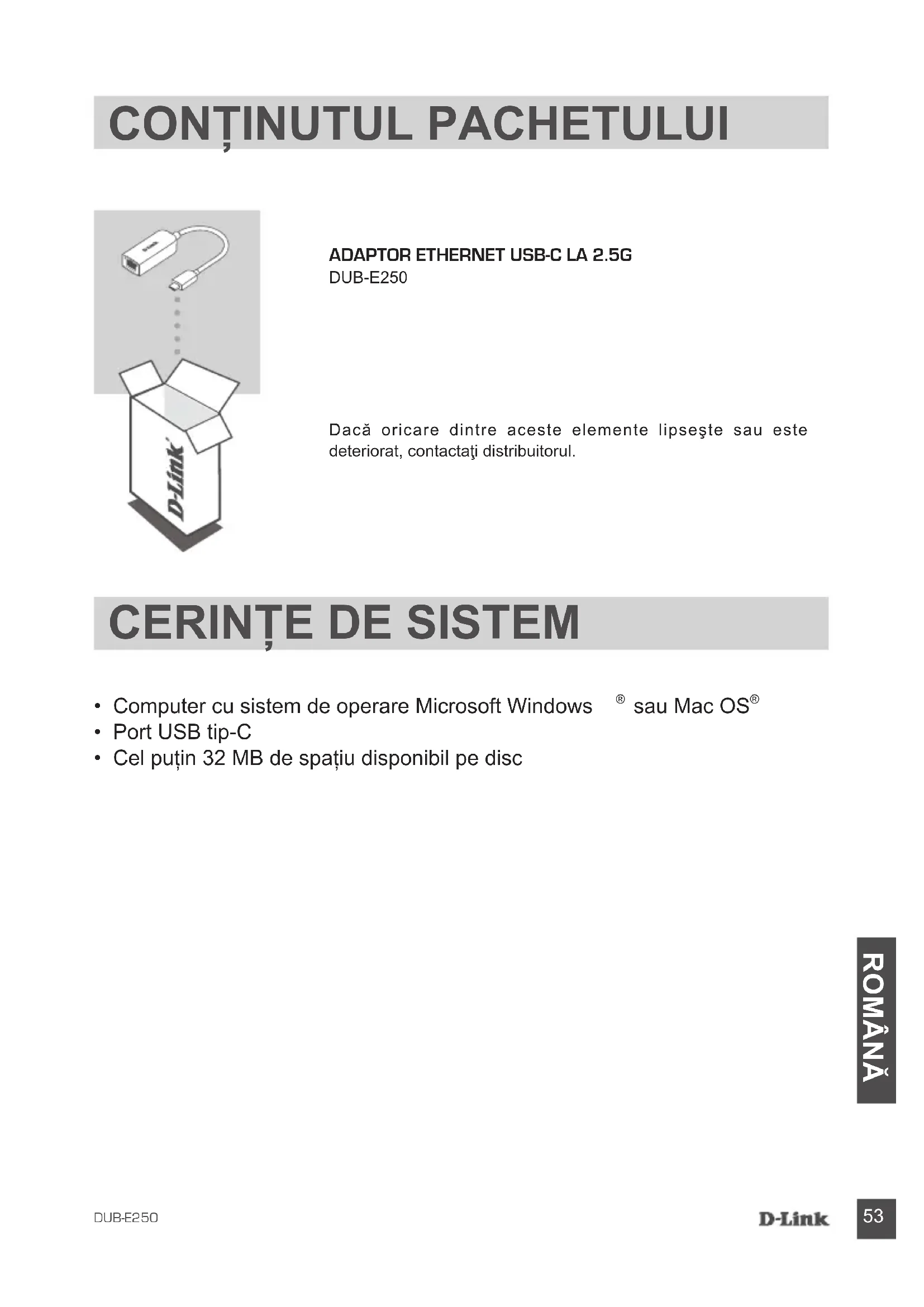 ROMÂNĂ AdAptor EthErnEt USB-C LA 2.5G DUB-E250 Dacă oricare dintre aceste elemente lipseşte sau este deteriorat, contactaţi distribuitorul.