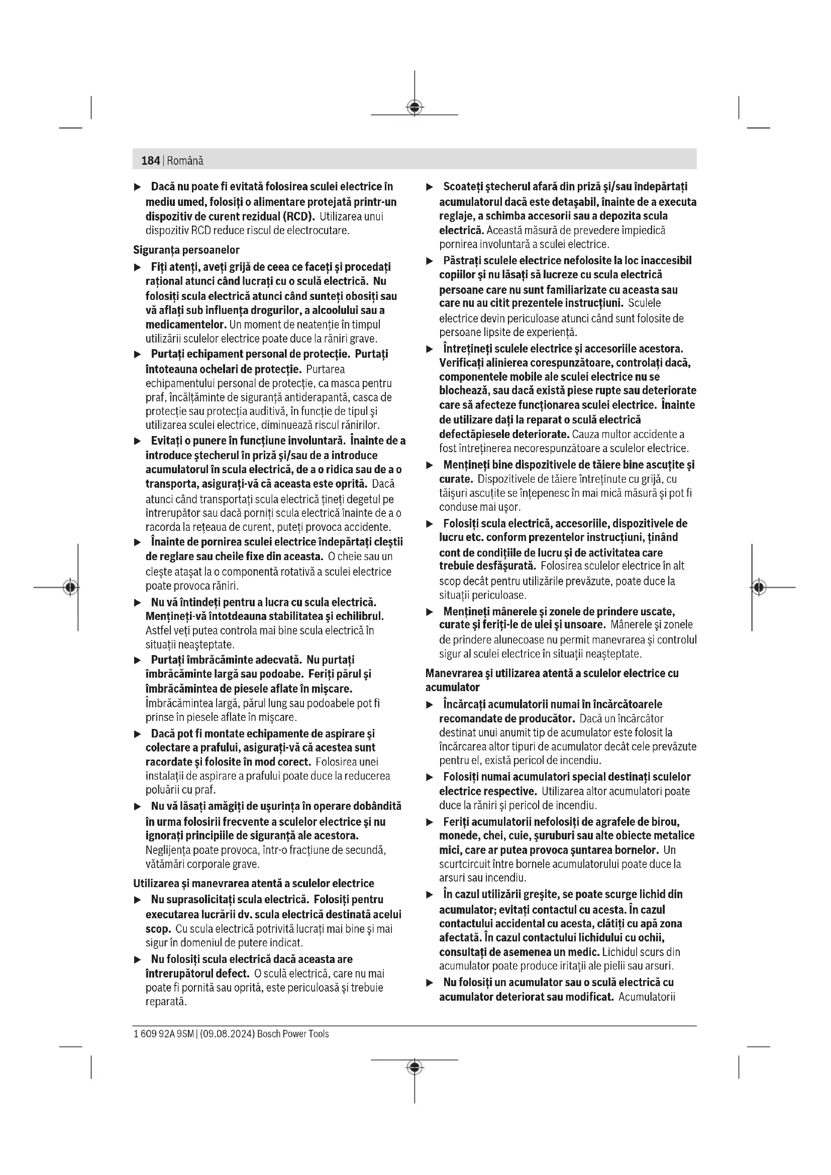 Аккумуляторлар/батареялар: Литий-иондық: Тасымалдау бөліміндегі нұсқауларды орындаңыз (қараңыз „Тасымалдау“, Бет183). Română Instrucţiuni de siguranţă Instrucţiuni generale de siguranţă pentru scule electrice AVERTIS- MENT Citiţi toate avertizările, instrucţiunile, ilustraţiile şi specificaţiile puse la dispoziţie împreună cu această sculă electrică. Nerespectarea instrucţiunilor menţionate mai jos poate duce la electrocutare, incendiu şi/sau vătămări corporale grave. Păstraţi toate indicaţiile de avertizare şi instrucţiunile în vederea utilizărilor viitoare. Termenul "sculă electrică" folosit în indicaţiile de avertizare se referă la sculele electrice alimentate de la reţea (cu cablu de alimentare) sau la sculele electrice cu acumulator (fără cablu de alimentare). Siguranţa la locul de muncă u Menţineţi‑vă sectorul de lucru curat şi bine iluminat. Dezordinea sau sectoarele de lucru neluminate pot duce la accidente. u Nu lucraţi cu sculele electrice în mediu cu pericol de explozie, în care există lichide, gaze sau pulberi inflamabile. Sculele electrice generează scântei care pot aprinde praful sau vaporii. u Nu permiteţi accesul copiilor şi al spectatorilor în timpul utilizării sculei electrice. Dacă vă este distrasă atenţia puteţi pierde controlul. Siguranţă electrică u Ştecherul sculei electrice trebuie să fie potrivit prizei electrice. Nu modificaţi niciodată ştecherul. Nu folosiţi fişe adaptoare la sculele electrice cu împământare (legate la masă). Ştecherele nemodificate şi prizele corespunzătoare diminuează riscul de electrocutare. u Evitaţi contactul corporal cu suprafeţe împământate sau legate la masă ca ţevi, instalaţii de încălzire, plite şi frigidere. Există un risc crescut de electrocutare atunci când corpul vă este împământat sau legat la masă. u Feriţi sculele electrice de ploaie sau umezeală. Pătrunderea apei într‑o sculă electrică măreşte riscul de electrocutare. u Nu schimbaţi destinaţia cablului. Nu folosiţi niciodată cablul pentru transportarea sau suspendarea sculei electrice ori pentru a trage ştecherul afară din priză. Feriţi cablul de căldură, ulei, muchii ascuţite sau componente aflate în mişcare. Cablurile deteriorate sau încurcate măresc riscul de electrocutare. u Atunci când lucraţi cu o sculă electrică în aer liber, folosiţi numai cabluri prelungitoare adecvate pentru mediul exterior. Folosirea unui cablu prelungitor adecvat pentru mediul exterior diminuează riscul de electrocutare. Bosch Power Tools 1 609 92A 9SM | (09.08.2024)184 | Română u Dacă nu poate fi evitată folosirea sculei electrice în mediu umed, folosiţi o alimentare protejată printr-un dispozitiv de curent rezidual (RCD). Utilizarea unui dispozitiv RCD reduce riscul de electrocutare. Siguranţa persoanelor u Fiţi atenţi, aveţi grijă de ceea ce faceţi şi procedaţi raţional atunci când lucraţi cu o sculă electrică. Nu folosiţi scula electrică atunci când sunteţi obosiţi sau vă aflaţi sub influenţa drogurilor, a alcoolului sau a medicamentelor. Un moment de neatenţie în timpul utilizării sculelor electrice poate duce la răniri grave. u Purtaţi echipament personal de protecţie. Purtaţi întoteauna ochelari de protecţie. Purtarea echipamentului personal de protecţie, ca masca pentru praf, încălţăminte de siguranţă antiderapantă, casca de protecţie sau protecţia auditivă, în funcţie de tipul şi utilizarea sculei electrice, diminuează riscul rănirilor. u Evitaţi o punere în funcţiune involuntară. Înainte de a introduce ştecherul în priză şi/sau de a introduce acumulatorul în scula electrică, de a o ridica sau de a o transporta, asiguraţi‑vă că aceasta este oprită. Dacă atunci când transportaţi scula electrică ţineţi degetul pe întrerupător sau dacă porniţi scula electrică înainte de a o racorda la reţeaua de curent, puteţi provoca accidente. u Înainte de pornirea sculei electrice îndepărtaţi cleştii de reglare sau cheile fixe din aceasta. O cheie sau un cleşte ataşat la o componentă rotativă a sculei electrice poate provoca răniri. u Nu vă întindeţi pentru a lucra cu scula electrică. Menţineţi-vă întotdeauna stabilitatea şi echilibrul. Astfel veţi putea controla mai bine scula electrică în situaţii neaşteptate. u Purtaţi îmbrăcăminte adecvată. Nu purtaţi îmbrăcăminte largă sau podoabe. Feriţi părul şi îmbrăcămintea de piesele aflate în mişcare. Îmbrăcămintea largă, părul lung sau podoabele pot fi prinse în piesele aflate în mişcare. u Dacă pot fi montate echipamente de aspirare şi colectare a prafului, asiguraţi‑vă că acestea sunt racordate şi folosite în mod corect. Folosirea unei instalaţii de aspirare a prafului poate duce la reducerea poluării cu praf. u Nu vă lăsaţi amăgiţi de uşurinţa în operare dobândită în urma folosirii frecvente a sculelor electrice şi nu ignoraţi principiile de siguranţă ale acestora. Neglijenţa poate provoca, într-o fracţiune de secundă, vătămări corporale grave. Utilizarea şi manevrarea atentă a sculelor electrice u Nu suprasolicitaţi scula electrică. Folosiţi pentru executarea lucrării dv. scula electrică destinată acelui scop. Cu scula electrică potrivită lucraţi mai bine şi mai sigur în domeniul de putere indicat. u Nu folosiţi scula electrică dacă aceasta are întrerupătorul defect. O sculă electrică, care nu mai poate fi pornită sau oprită, este periculoasă şi trebuie reparată. u Scoateţi ştecherul afară din priză şi/sau îndepărtaţi acumulatorul dacă este detaşabil, înainte de a executa reglaje, a schimba accesorii sau a depozita scula electrică. Această măsură de prevedere împiedică pornirea involuntară a sculei electrice. u Păstraţi s