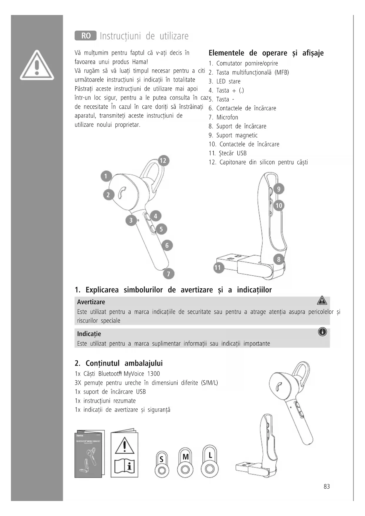 MyVoice 1300 3X pernuțe pentru ureche în dimensiuni diferite (S/M/L) 1x suport de încărcare USB 1x instrucțiuni rezumate 1x indicații de avertizare și siguranță