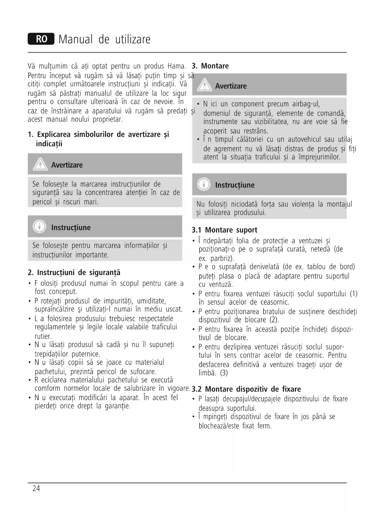 - În timpul călătoriei cu un autovehicul sau utilaj de agrement nu vă lăsați distras de produs și ți atent la situația tracului și a împrejurimilor. Instrucțiune Nu folosiți niciodată forța sau violența la montajul și utilizarea produsului.