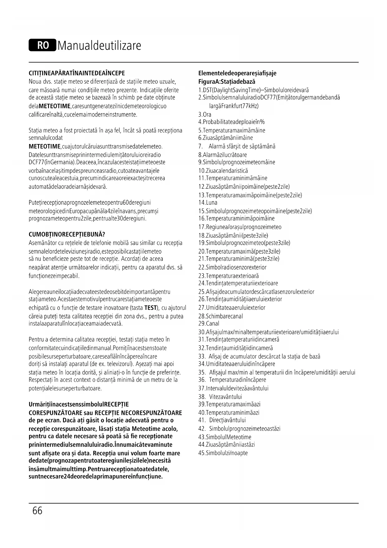 A Tasta MODE = Setările/conrmarea valorii setate B Tasta CHANNEL = Căutare manuală a semnalului senzorului exterior/selecția canalului C Tasta DAY/NIGHT/SNOOZE/LIGHT = Întreruperea semnalului de trezire/activarea iluminatului de fundal/comutarea valorii așate între zi și noapte D Tasta TEST = Vericarea calității semnalului DCF E Tasta UP = Creșterea valorii de setare actuale/accesarea valorilor maxime/minime salvate (MAX/MIN)/datele meteo scurt în domeniul înalt (37–45) F Tasta DOWN = Reducerea valorii de setare actuale/activarea/dezactivarea recepției manuale a semnalului DCF/selecția unei locații din lista de favorite G Piciorul de susținere H Compartimentul bateriilor I Decupaj pentru montajul pe perete