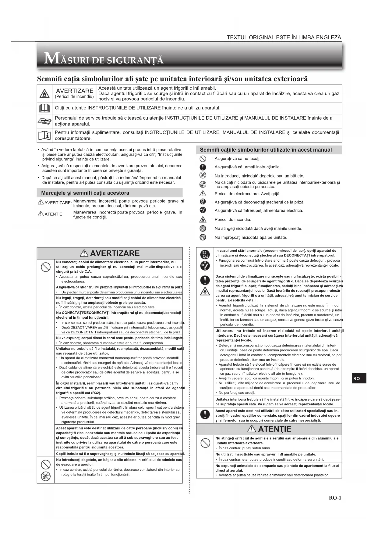 - Având în vedere faptul că în componenţa acestui produs intră piese rotative şi piese care ar putea cauza electrocutări, asiguraţi-vă că citiţi “Instrucţiunile privind siguranţa” înainte de utilizare.• Asiguraţi-vă că respectaţi elementele de avertizare prezentate aici, deoarece acestea sunt importante în ceea ce priveşte siguranţa.• După ce aţi citit acest manual, păstraţi-l la îndemână împreună cu manualul de instalare, pentru a-l putea consulta cu uşurinţă oricând este necesar. Marcajele şi semnifi caţia acestora AVERTIZARE:Manevrarea incorectă poate provoca pericole grave şi iminente, precum decesul, rănirea gravă etc. ATENŢIE:Manevrarea incorectă poate provoca pericole grave, în funcţie de condiţii. AVERTIZARE Nu conectaţi cablul de alimentare electrică la un punct intermediar, nu utilizaţi un cablu prelungitor şi nu conectaţi mai multe dispozitive la o singură priză de C.A.• Aceasta ar putea cauza supraîncălzirea, producerea unui incendiu sau electrocutarea.Asiguraţi-vă că ştecherul nu prezintă impurităţi şi introduceţi-l în siguranţă în priză. Un ştecher murdar poate determina producerea unui incendiu sau electrocutarea.Nu legaţi, trageţi, deterioraţi sau modifi caţi cablul de alimentare electrică, nu îl încălziţi şi nu amplasaţi obiecte grele pe acesta.• În caz contrar, există pericolul de incendiu sau electrocutare.Nu CONECTAŢI/DECONECTAŢI întrerupătorul şi nu deconectaţi/conectaţi ştecherul în timpul funcţionării. În caz contrar, se pot produce scântei care ar putea cauza producerea unui incendiu. După DEZACTIVAREA unităţii interioare prin intermediul telecomenzii, asiguraţi-vă că DECONECTAŢI întrerupătorul sau că deconectaţi ştecherul de la priză. Nu vă expuneţi corpul direct la aerul rece pentru perioade de timp îndelungate.• În caz contrar, sănătatea dumneavoastră ar putea fi compromisă.Unitatea nu trebuie să fi e instalată, reamplasată, dezasamblată, modifi cată sau reparată de către utilizator.• Un aparat de climatizare manevrat necorespunzător poate provoca incendii, electrocutări, răniri sau scurgeri de apă etc. Adresaţi-vă reprezentanţei locale.• Dacă cablul de alimentare electrică este deteriorat, acesta trebuie să fi e înlocuit de către producător sau de către agentul de service al acestuia, pentru a se evita situaţiile periculoase.În cazul instalării, reamplasării sau întreținerii unităţii, asiguraţi-vă că în circuitul frigorifi c nu pătrunde nicio altă substanţă în afară de agentul frigorifi c specifi cat (R32).• Prezenţa oricărei substanţe străine, precum aerul, poate cauza o creştere anormală a presiunii, putând avea ca rezultat explozia sau rănirea.• Utilizarea oricărui alt tip de agent frigorifi c în afara celui specifi cat pentru sistem va determina producerea de defecţiuni mecanice, defectarea sistemului sau avarierea unităţii. În cel mai rău caz, aceasta ar putea periclita în mod grav siguranţa produsului.Acest aparat nu este destinat utilizării de către persoane (inclusiv copii) cu capacităţi fi zice, senzoriale sau mentale reduse sau lipsite de experienţă şi cunoştinţe, decât dacă acestea se afl ă sub supraveghere sau au fost instruite cu privire la utilizarea aparatului de către o persoană care este responsabilă pentru siguranţa acestora.Copiii trebuie să fi e supravegheaţi şi nu trebuie lăsaţi să se joace cu aparatul. Nu introduceţi degetele, un băţ sau alte obiecte în orifi ciul de admisie sau de evacuare a aerului.• În caz contrar, există pericolul de rănire, deoarece ventilatorul din interior se roteşte la turaţii înalte în timpul funcţionării. În cazul unei stări anormale (precum mirosul de aer), opriţi aparatul de climatizare şi deconectaţi ştecherul sau DECONECTAŢI întrerupătorul.• Funcţionarea continuă într-o stare anormală poate cauza defecţiuni, provoca incendii sau electrocutarea. În acest caz, adresaţi-vă reprezentanţei locale. Dacă sistemul de climatizare nu răceşte sau nu încălzeşte, există posibili-tatea prezenţei de scurgeri de agent frigorifi c. Dacă se depistează scurgeri de agent frigorifi c, opriţi funcţionarea, aerisiţi bine încăperea şi adresaţi-vă imediat reprezentanţei locale. Dacă lucrările de reparaţii presupun reîncăr-carea cu agent frigorifi c a unităţii, adresaţi-vă unui tehnician de service pentru a-i solicita detalii.• Agentul frigorifi c utilizat în sistemul de climatizare nu este nociv. În mod normal, acesta nu se scurge. Totuşi, dacă agentul frigorifi c se scurge şi intră în contact cu fl ăcări sau cu un aparat de încălzire, precum o aerotermă, un încălzitor cu kerosen sau un aragaz, acesta va genera gaze toxice şi va cauza pericolul de incendiu.Utilizatorul nu trebuie să încerce niciodată să spele interiorul unităţii interioare. Dacă este necesară curăţarea interiorului unităţii, adresaţi-vă reprezentanţei locale.• Detergenţii necorespunzători pot cauza deteriorarea materialului din interi-orul unităţii, ceea ce poate determina producerea scurgerilor de apă. Dacă detergentul intră în contact cu componentele electrice sau cu motorul, se pot produce deteriorări, fum sau un incendiu.• Aparatul trebuie să fi e stocat într-o încăpere în care să nu existe surse de aprindere cu funcţionare continuă (de exemplu: fl ăcări deschise, un aparat cu gaz sau un încălzitor electric afl ate în funcţiune).• Aveţi în vedere faptul că agenţii frigorifi ci ar putea fi inodori.• Nu utilizaţi alte mijloace de accelerare a procesului de degivrare sau de curăţare a aparatului decât cele recomandate de producător.• Nu perforaţi sau ardeţi.Unitatea interioară trebuie să fi e instalată într-o încăpere care să depăşeas-că suprafaţa specifi cată. Vă rugăm să vă adresaţi reprezentanţe