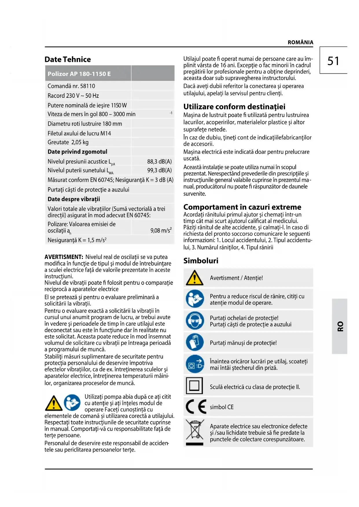 ROMÂNIA Date Tehnice Polizor AP 180-1150 E Comandă nr. 58110 Racord 230 V ~ 50 Hz Putere nominală de ieşire 1150 W Viteza de mers în gol 800 – 3000 min