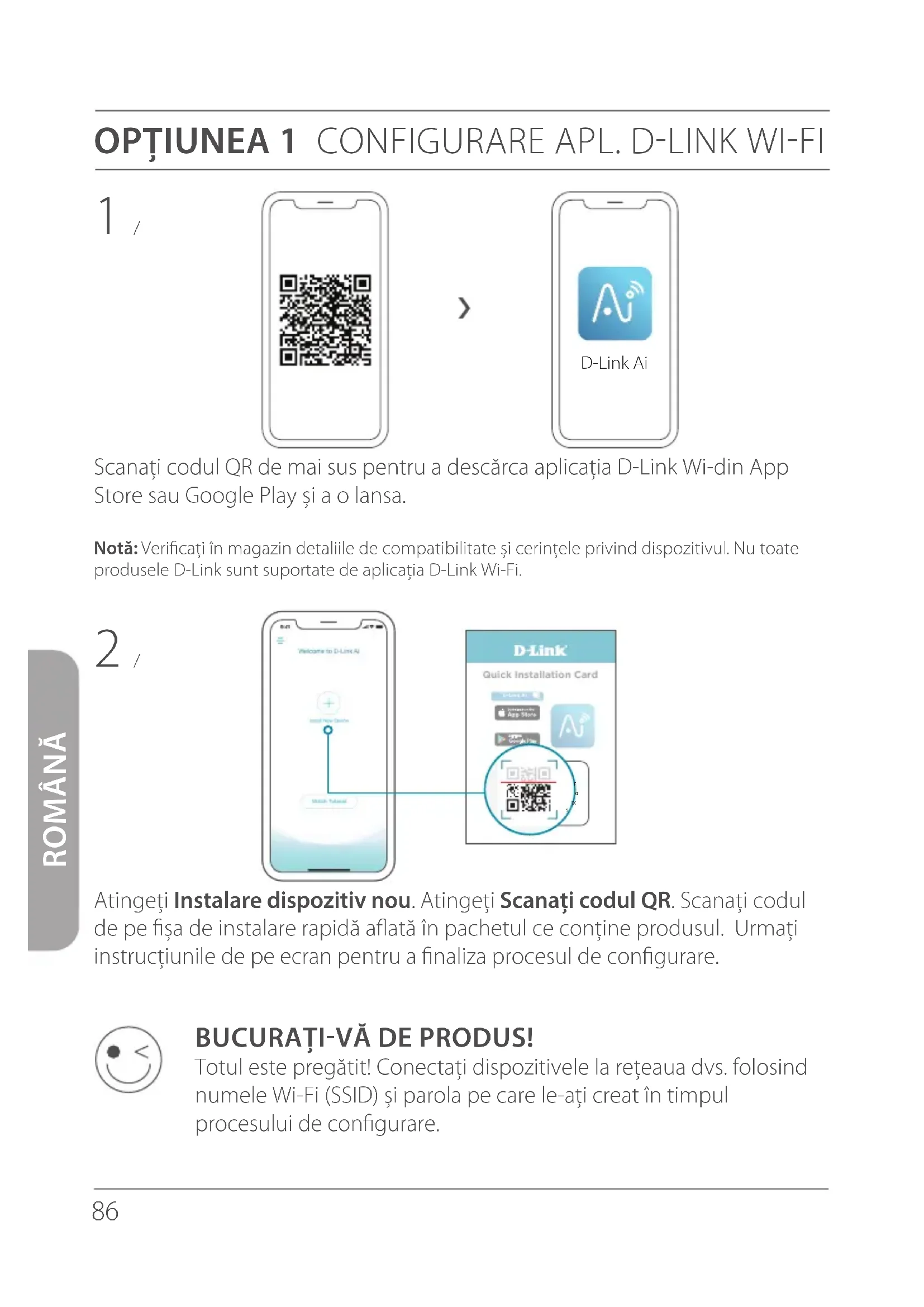 BUCURAȚI-VĂ DE PRODUS! Totul este pregătit! Conectaţi dispozitivele la reţeaua dvs. folosind numele Wi-Fi (SSID) și parola pe care le-aţi creat în timpul procesului de configurare. D-Link AiQuick Installation Card “D-Link Ai ” Model Name: DEVICE Wi-Fi Name: E15-XXXX Password: XXXXXXXX