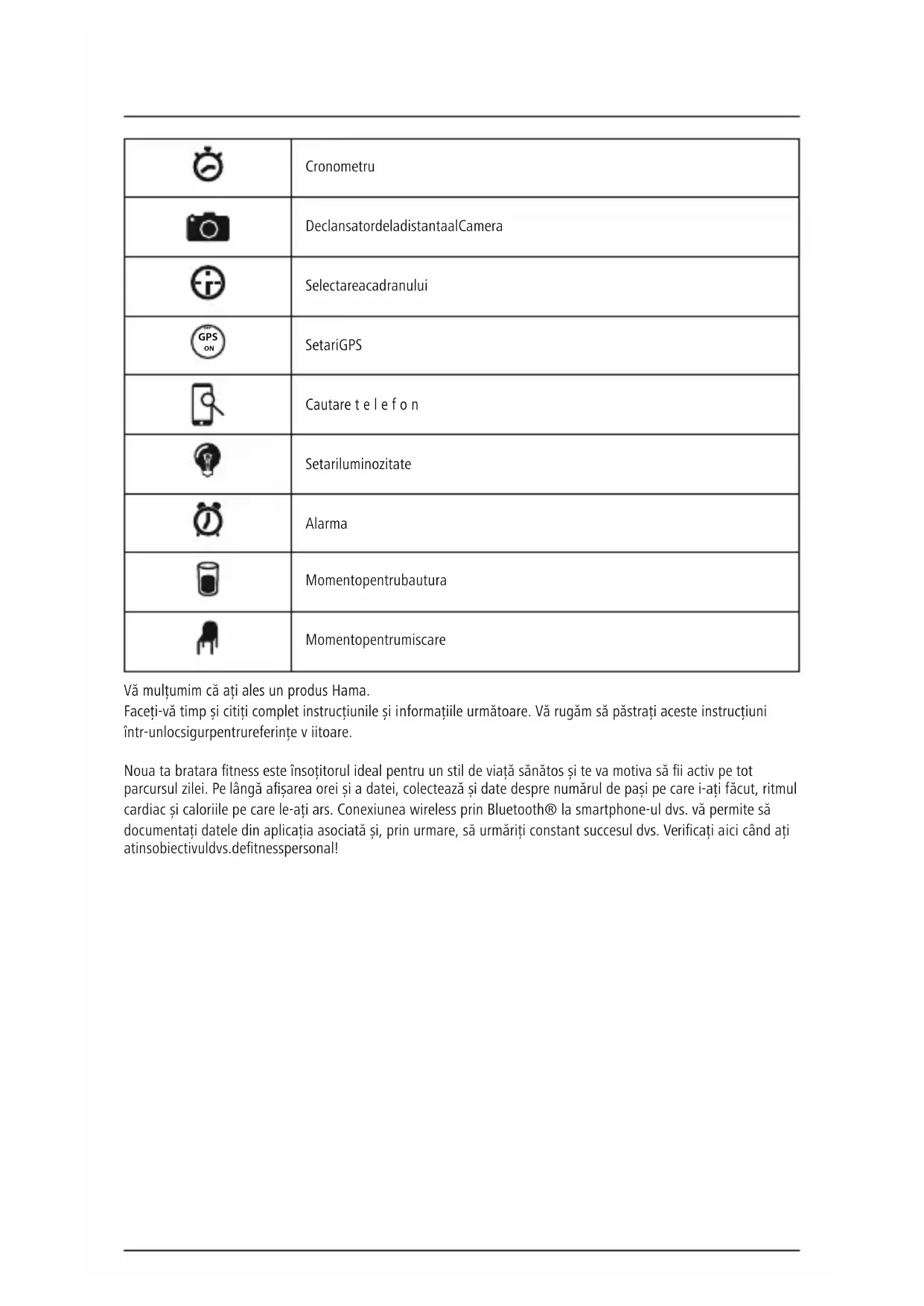 OFF Setari GPS Cautaretelefon Setari luminozitate Alarma Momento pentru bautura Momento pentru miscare Vă mulțumim că ațiales un produs Hama. Faceți-vă timp șicitițicomplet instrucțiunile șiinformațiile următoare. Vă rugămsăpăstrațiaceste instrucțiuni într-un loc sigur pentru referințeviitoare. Noua ta bratara tness este însoțitorul ideal pentru un stil de viață sănătos șitevamotiva săiactiv pe tot parcursul zilei. Pe lângă așarea orei șiadatei, colecteazășidate desprenumărul de pașipecarei-ațifăcut, ritmul cardiac șicaloriile pe carele-ațiars. Conexiunea wireless prin Bluetooth® la smartphone-ul dvs. vă permite să documentațidatele din aplicația asociatăși, prin urmare, să urmărițiconstant succesul dvs. Vericațiaici când ați atins obiectivul dvs. de tness personal!1. Explicarea simbolurilor șinotelor de avertizare Avertizare Acest simbol este utilizat pentru aindica instrucțiuni de siguranță sau pentru avăatrage atenția asupra pericolelor șiriscurilor specice. Notă Acest simbol este utilizat pentru aindica informații suplimentaresau note importante.