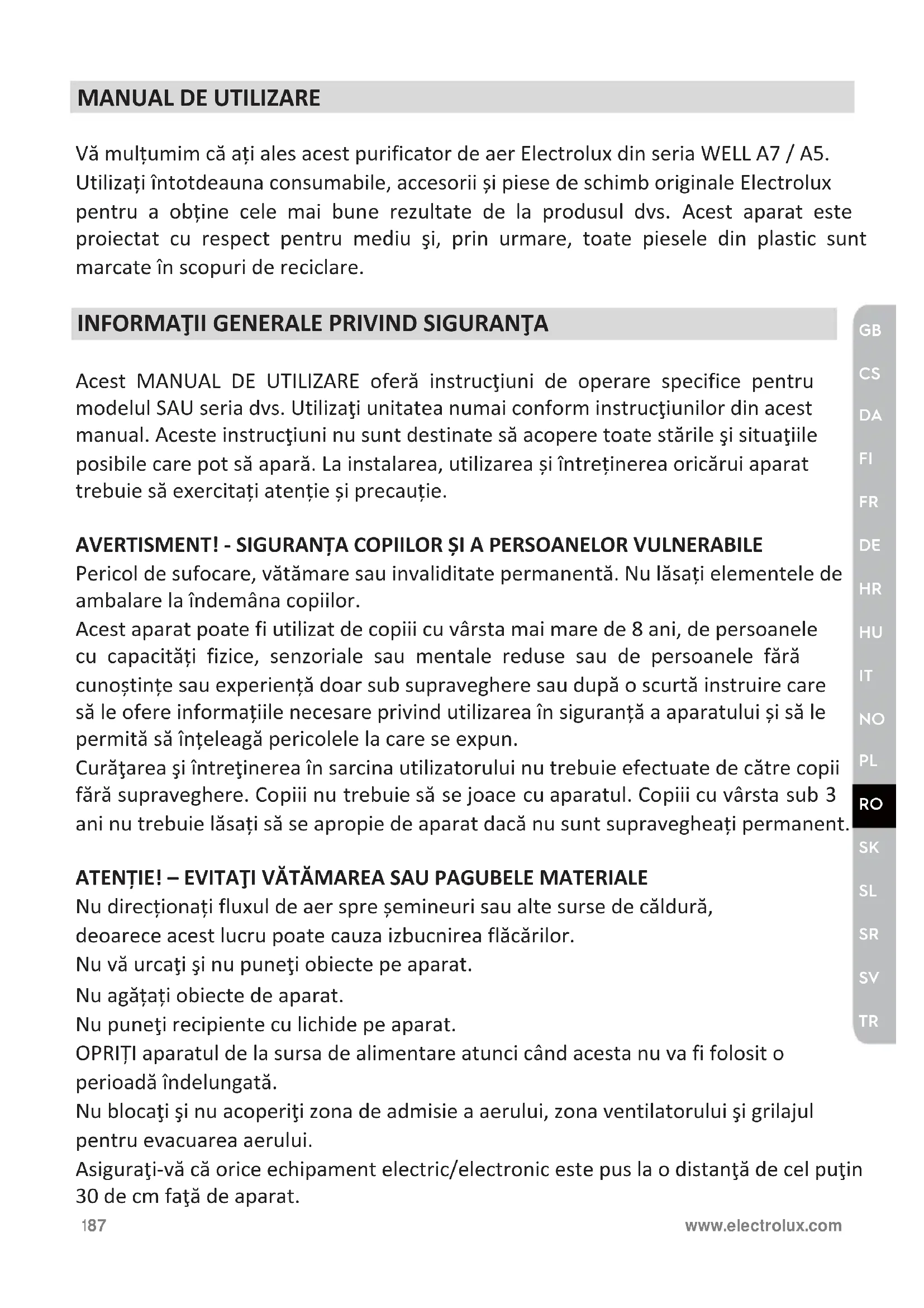 Vă mulțumim că ați ales acest purificator de aer Electrolux din seria WELL A7 / A5. Utilizați întotdeauna consumabile, accesorii și piese de schimb originale Electrolux pentru a obține cele mai bune rezultate de la produsul dvs. Acest aparat este proiectat cu respect pentru mediu şi, prin urmare, toate piesele din plastic sunt marcate în scopuri de reciclare.