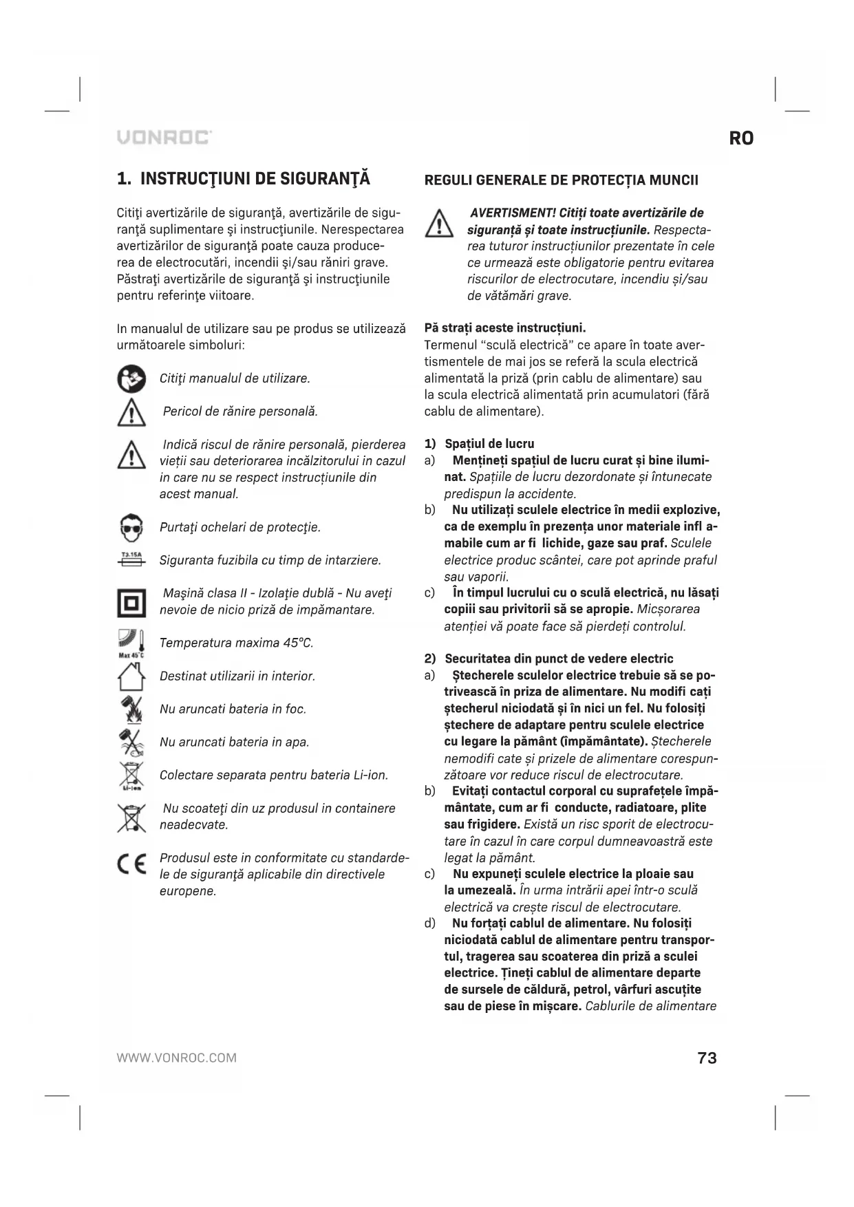 Aparatele electrice sau electronice deteriorate si/sau defecte trebuie colectate în locurile de reciclare corespunzatoare. Numai pentru tarile din CE Nu aruncati echipamentele actionate electric îm- preuna cu gunoiul menajer. Conform Indicatiei eu- ropene 2012/19/EU pentru echipamente electrice si electronice uzate si a implementarii sale la nivel national, echipamentele actionate electric scoase din uz trebuie colectate separat si evacuate într-o maniera ecologica. GARANŢIE Produsele VONROC sunt realizate la cele mai inalte standarde de calitate şi sunt garantate in pri- vinţa materialelor şi a manoperei pentru intreaga perioadă de utilizare in garanţie, incepand cu data achiziţiei. In cazul in care produsul se defectează in timpul perioadei de utilizare, contactaţi direct VONROC. Următoarele circumstanţe sunt excluse de la această garanţie: