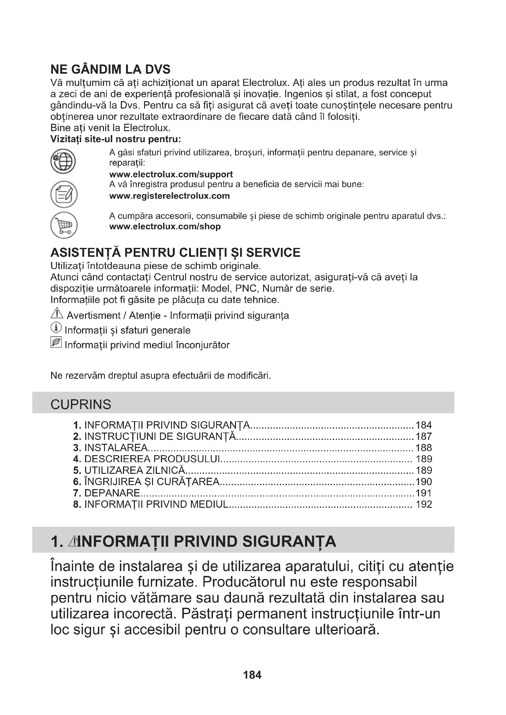 Vă mulțumim că ați achiziționat un aparat Electrolux. Aţi ales un produs rezultat în urma a zeci de ani de experienţă profesională şi inovaţie. Ingenios şi stilat, a fost conceput gândindu-vă la Dvs. Pentru ca să fiți asigurat că aveți toate cunoștințele necesare pentru obținerea unor rezultate extraordinare de fiecare dată când îl folosiți. Bine ați venit la Electrolux.Vizitați site-ul nostru pentru: A găsi sfaturi privind utilizarea, broșuri, informații pentru depanare, service și reparații:www.electrolux.com/supportA vă înregistra produsul pentru a beneficia de servicii mai bune:www.registerelectrolux.comA cumpăra accesorii, consumabile și piese de schimb originale pentru aparatul dvs.:www.electrolux.com/shop