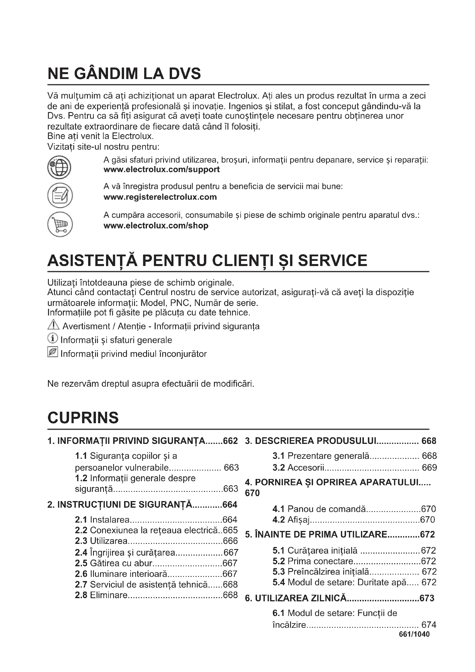 Recicle os materiais que apresentem o símbolo . Coloque a embalagem nos contentores indicados para reciclagem. Ajude a proteger o ambiente e a saúde pública através da reciclagem dos aparelhos eléctricos e electrónicos. Não elimine os aparelhos que tenham o símbolo juntamente com os resíduos domésticos. Coloque o produto num ponto de recolha para reciclagem local ou contacte as suas autoridades municipais. 660/1040 UTILIZE UM ATALHO!NE GÂNDIM LA DVS Vă mulțumim că ați achiziționat un aparat Electrolux. Aţi ales un produs rezultat în urma a zeci de ani de experienţă profesională şi inovaţie. Ingenios şi stilat, a fost conceput gândindu-vă la Dvs. Pentru ca să fiți asigurat că aveți toate cunoștințele necesare pentru obținerea unor rezultate extraordinare de fiecare dată când îl folosiți. Bine ați venit la Electrolux. Vizitați site-ul nostru pentru: A găsi sfaturi privind utilizarea, broșuri, informații pentru depanare, service și reparații: www.electrolux.com/support A vă înregistra produsul pentru a beneficia de servicii mai bune: www.registerelectrolux.com A cumpăra accesorii, consumabile și piese de schimb originale pentru aparatul dvs.: www.electrolux.com/shop