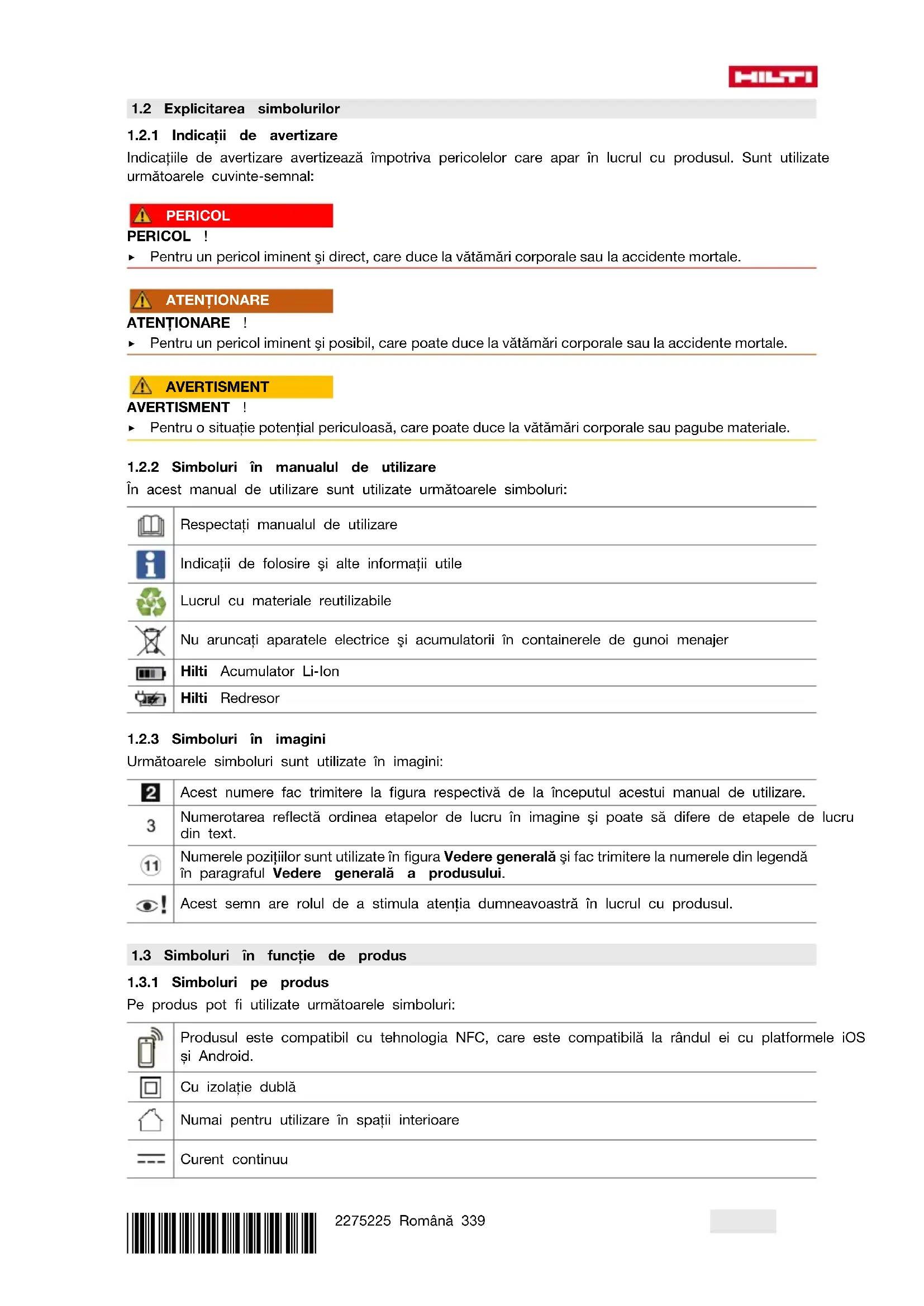 În acest manual de utilizare sunt utilizate următoarele simboluri: Respectaţi manualul de utilizare Indicaţii de folosire şi alte informaţii utile Lucrul cu materiale reutilizabile Nu aruncaţi aparatele electrice şi acumulatorii în containerele de gunoi menajer Hilti Acumulator LiIon Hilti Redresor