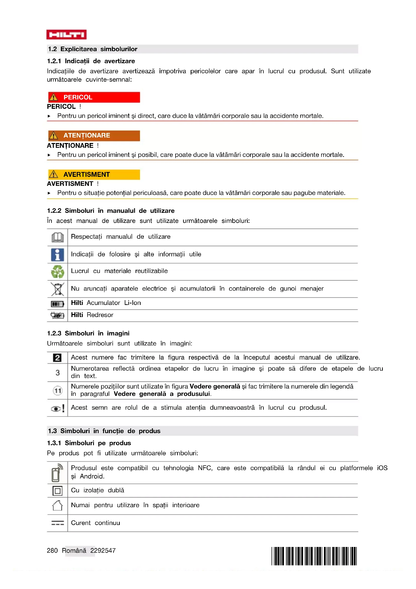 În acest manual de utilizare sunt utilizate următoarele simboluri: Respectaţi manualul de utilizare Indicaţii de folosire şi alte informaţii utile Lucrul cu materiale reutilizabile Nu aruncaţi aparatele electrice şi acumulatorii în containerele de gunoi menajer Hilti Acumulator LiIon Hilti Redresor