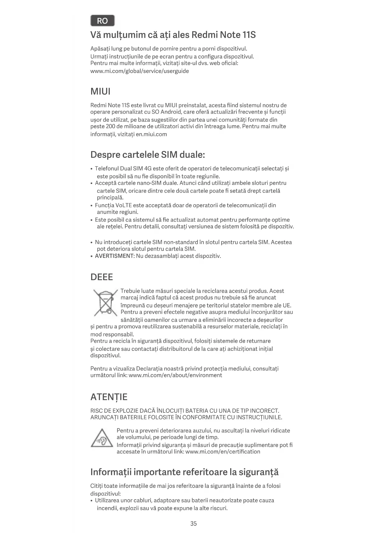 - AVERTISMENT: Nu dezasamblați acest dispozitiv. DEEE Trebuie luate măsuri speciale la reciclarea acestui produs. Acest marcaj indică faptul că acest produs nu trebuie să fie aruncat împreună cu deșeuri menajere pe teritoriul statelor membre ale UE. Pentru a preveni efectele negative asupra mediului înconjurător sau sănătății oamenilor ca urmare a eliminării incorecte a deșeurilor și pentru a promova reutilizarea sustenabilă a resurselor materiale, reciclați în mod responsabil. Pentru a recicla în siguranță dispozitivul, folosiți sistemele de returnare și colectare sau contactați distribuitorul de la care ați achiziționat inițial dispozitivul. Pentru a vizualiza Declarația noastră privind protecția mediului, consultați următorul link: www.mi.com/en/about/environment ATENȚIE RISC DE EXPLOZIE DACĂ ÎNLOCUIȚI BATERIA CU UNA DE TIP INCORECT. ARUNCAȚI BATERIILE FOLOSITE ÎN CONFORMITATE CU INSTRUCȚIUNILE. Pentru a preveni deteriorarea auzului, nu ascultați la niveluri ridicate ale volumului, pe perioade lungi de timp. Informații privind siguranța și măsuri de precauție suplimentare pot fi accesate în următorul link: www.mi.com/en/certification Informații importante referitoare la siguranță Citiți toate informațiile de mai jos referitoare la siguranță înainte de a folosi dispozitivul: