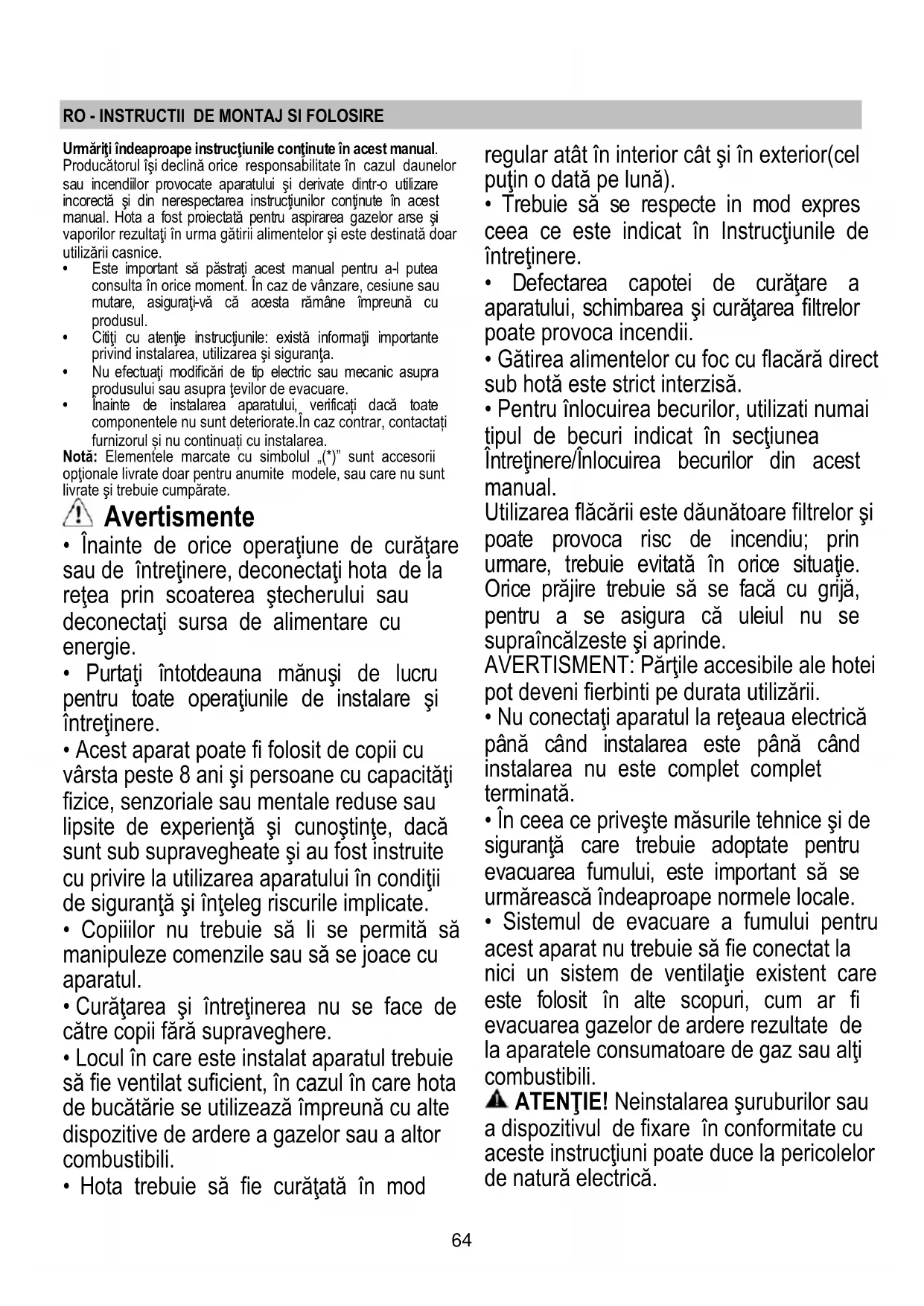 - Sistemul de evacuare a fumului pentru acest aparat nu trebuie să fie conectat la nici un sistem de ventilaţie existent care este folosit în alte scopuri, cum ar fi evacuarea gazelor de ardere rezultate de la aparatele consumatoare de gaz sau alţi combustibili. ATENŢIE! Neinstalarea şuruburilor sau a dispozitivul de fixare în conformitate cu aceste instrucţiuni poate duce la pericolelor de natură electrică.65