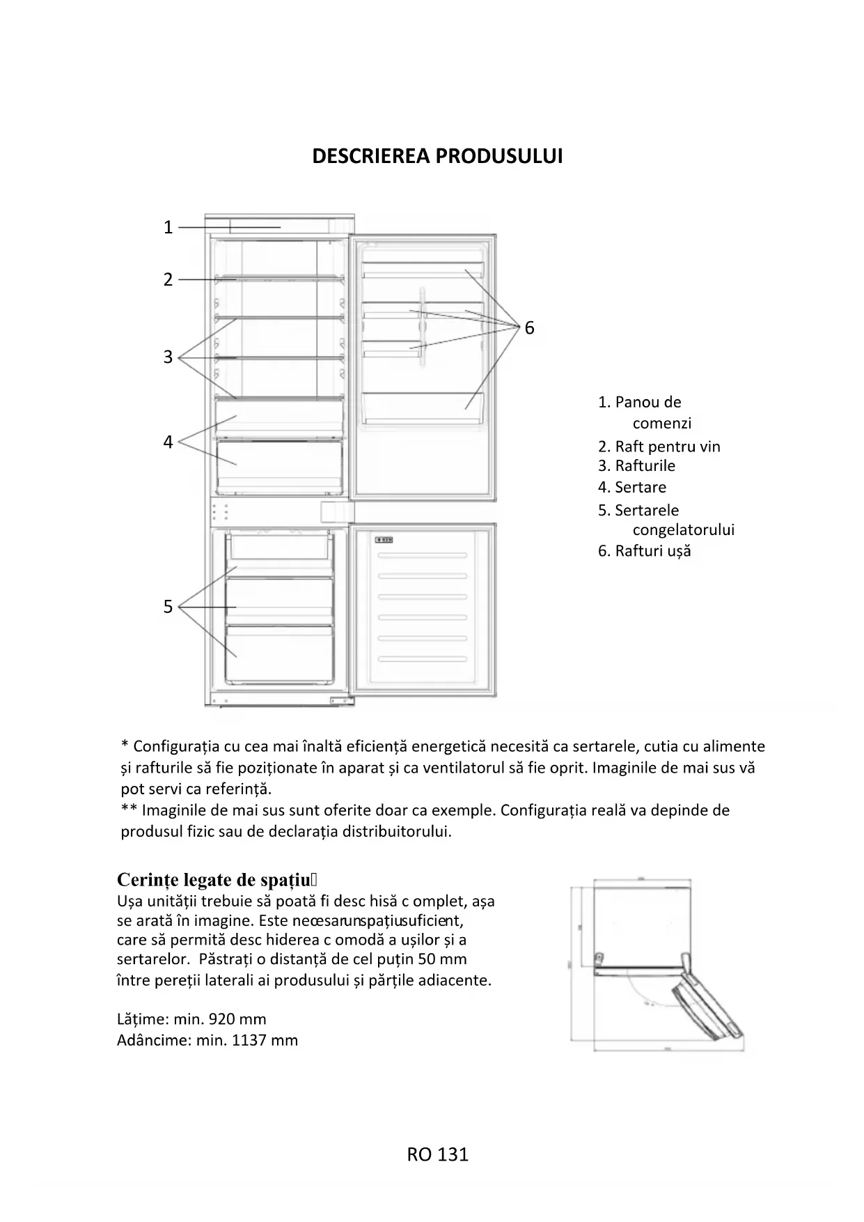 - Configurația cu cea mai înaltă eficiență energetică necesită ca sertarele, cutia cu alimenteși rafturile să fie poziționate în aparat și ca ventilatorul să fie oprit. Imaginile de mai sus vă pot servi ca referință.** Imaginile de mai sus sunt oferite doar ca exemple. Configurația reală va depinde deprodusul fizic sau de declarația distribuitorului. Cerințe legate de spațiu Ușa unității trebuie să poată fi desc hisă c omplet, așa se arată în imagine. Este nec esar un spațiu suficie nt, care să permită desc hiderea c omodă a ușilor și a sertarelor. Păstrați o distanță de cel puțin 50 mm între pereții laterali ai produsului și părțile adiacente.Lățime: min. 920 mmAdâncime: min. 1137 mm1. Panou decomenzi2. Raft pentru vin3. Rafturile4. Sertare5. Sertarelecongelatorului6. Rafturi ușă