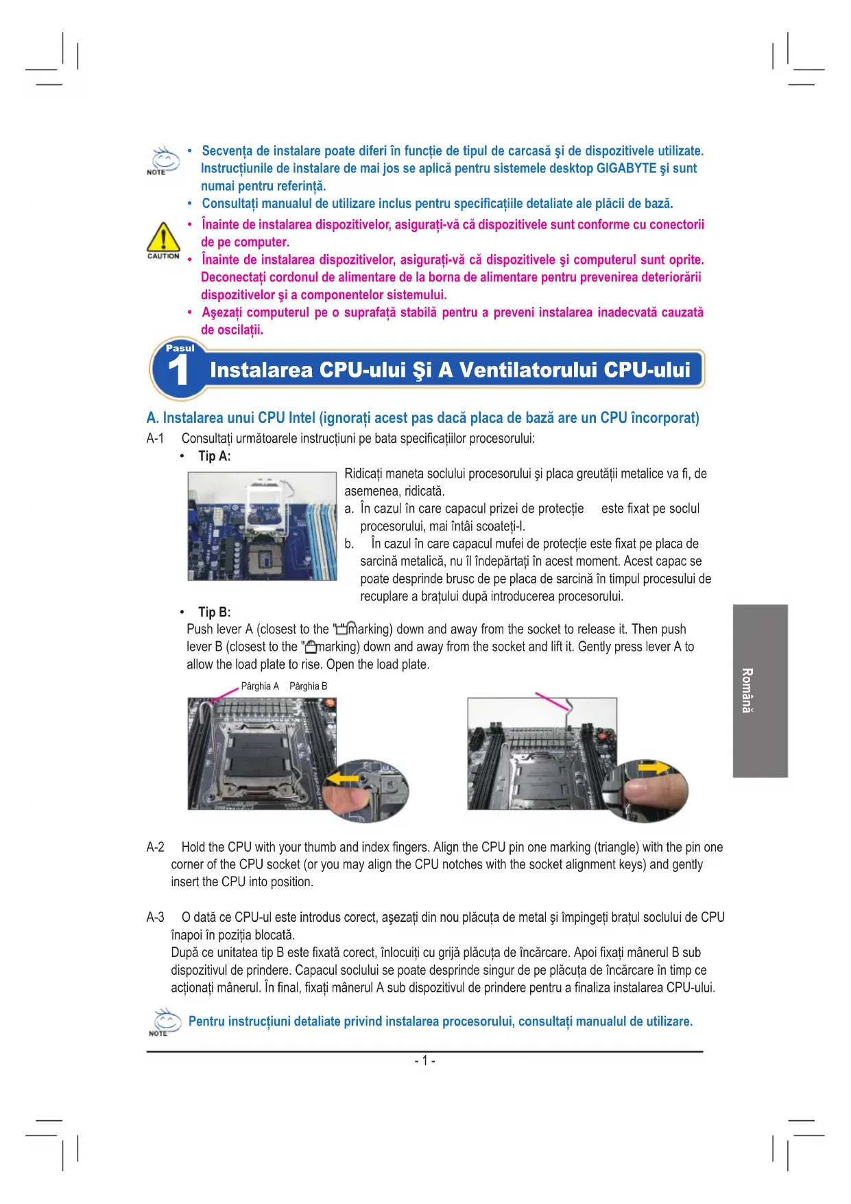 - Tip B: Push lever A (closest to the " " marking) down and away from the socket to release it. Then push lever B (closest to the " " marking) down and away from the socket and lift it. Gently press lever A to allow the load plate to rise. Open the load plate. A-1 Consultaţiurmătoareleinstrucţiunipebataspecicaţiilorprocesorului: