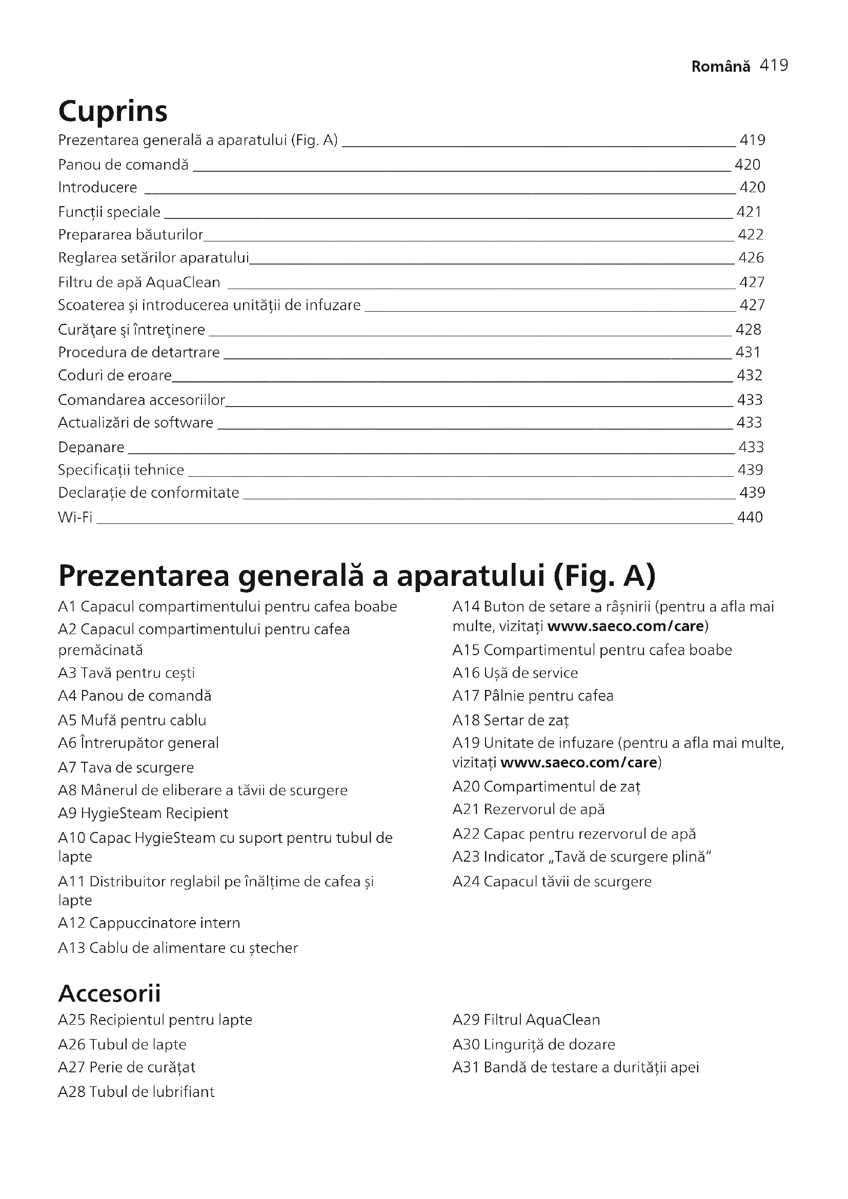 Română Cuprins Prezentarea generală a aparatului (Fig. A) ____________________________________________________ 419 Panou de comandă _______________________________________________________________________ 420 Introducere ______________________________________________________________________________ 420 Funcții speciale ___________________________________________________________________________ 421 Prepararea băuturilor______________________________________________________________________ 422 Reglarea setărilor aparatului________________________________________________________________ 426 Filtru de apă AquaClean ___________________________________________________________________ 427 Scoaterea și introducerea unității de infuzare _________________________________________________ 427 Curăţare şi întreţinere _____________________________________________________________________ 428 Procedura de detartrare ___________________________________________________________________ 431 Coduri de eroare__________________________________________________________________________ 432 Comandarea accesoriilor___________________________________________________________________ 433 Actualizări de software ____________________________________________________________________ 433 Depanare ________________________________________________________________________________ 433 Specificații tehnice ________________________________________________________________________ 439 Declarație de conformitate _________________________________________________________________ 439 Wi-Fi ____________________________________________________________________________________ 440 Prezentarea generală a aparatului (Fig. A) A1 Capacul compartimentului pentru cafea boabe A2 Capacul compartimentului pentru cafea premăcinată A3 Tavă pentru cești A4 Panou de comandă A5 Mufă pentru cablu A6 Întrerupător general A7 Tava de scurgere A8 Mânerul de eliberare a tăvii de scurgere A9 HygieSteam Recipient A10 Capac HygieSteam cu suport pentru tubul de lapte A11 Distribuitor reglabil pe înălțime de cafea și lapte A12 Cappuccinatore intern A13 Cablu de alimentare cu ștecher A14 Buton de setare a râșnirii (pentru a afla mai multe, vizitați www.saeco.com/care) A15 Compartimentul pentru cafea boabe A16 Ușă de service A17 Pâlnie pentru cafea A18 Sertar de zaț A19 Unitate de infuzare (pentru a afla mai multe, vizitați www.saeco.com/care) A20 Compartimentul de zaț A21 Rezervorul de apă A22 Capac pentru rezervorul de apă A23 Indicator „Tavă de scurgere plină” A24 Capacul tăvii de scurgere Accesorii A25 Recipientul pentru lapte A26 Tubul de lapte A27 Perie de curățat A28 Tubul de lubrifiant A29 Filtrul AquaClean A30 Linguriță de dozare A31 Bandă de testare a durității apei420 Română Panou de comandă Există două versiuni ale acestui espressor. Panourile lor de comandă au un aspect diferit, dar toate pictogramele funcționează în același mod. Consultați figurile B și C pentru o prezentare generală a tuturor pictogramelor. Puteți găsi descrierile mai jos. B1 Off icon (B1 Pictograma oprit) C1 On/off icon (C1 Pictograma pornire/oprire) B2/C2 Drinks (B2/C2 Băuturi) B3/C3 Drinks menu (B3/C3 Meniul de băuturi) B4/C4 Personal profiles (B4/C4 Profiluri personale) B5/C5 Boabe B6/C6 Machine settings (B6/C6 Setări aparat) B7/C7 Status menu (B7/C7 Meniul de stare) B8/C8 Magazin B9/C9 Start/stop icon (B9/C9 Pictograma pornire/oprire ) Introducere Felicitări pentru achiziționarea unei cafetiere complet automate Saeco! Pentru a beneficia pe deplin de asistența online oferită de Saeco, puteți utiliza panoul de comandă pentru a vă înregistra aparatul prin intermediul conexiunii Wi-Fi încorporate sau vă puteți înregistra produsul accesând www.saeco.com/MyCoffeeMachine. Citiţi cu atenţie broşură separată cu informaţii referitoare la siguranţă înainte de a utiliza pentru prima oară aparatul şi păstraţi-o pentru consultare ulterioară. Cafetiera complet automată Saeco vă permite să vă conectați la rețeaua Wi-Fi pentru a vă îmbunătăți experiența legată de cafea. Prin conectarea aparatului la rețeaua Wi-Fi, veți putea: