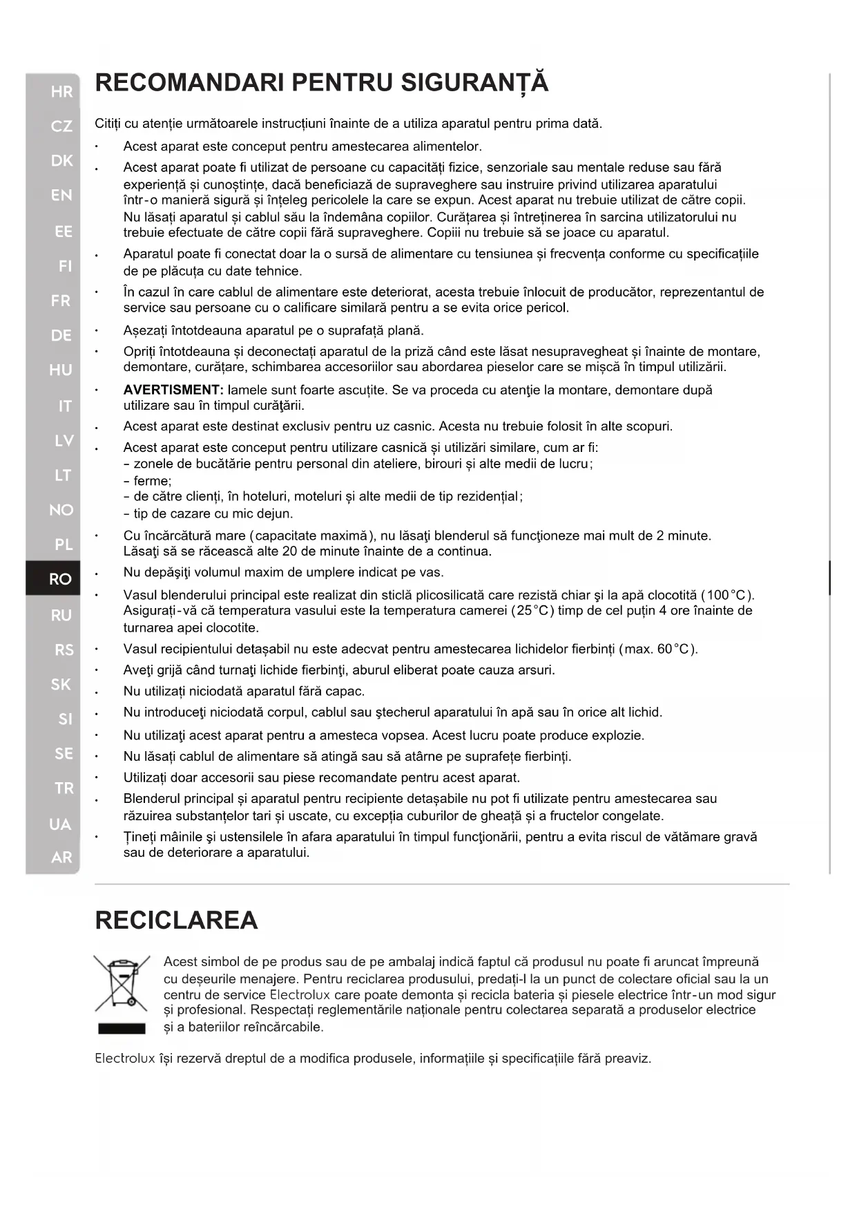 RECICLAREA Acest simbol de pe produs sau de pe ambalaj indică faptul că produsul nu poate fi aruncat împreună cu deșeurile menajere. Pentru reciclarea produsului, predați-l la un punct de colectare oficial sau la un centru de service Electrolux care poate demonta și recicla bateria și piesele electrice într-un mod sigur și profesional. Respectați reglementările naționale pentru colectarea separată a produselor electrice și a bateriilor reîncărcabile. Electrolux își rezervă dreptul de a modifica produsele, informațiile și specificațiile fără preaviz. Citiți cu atenție următoarele instrucțiuni înainte de a utiliza aparatul pentru prima dată.