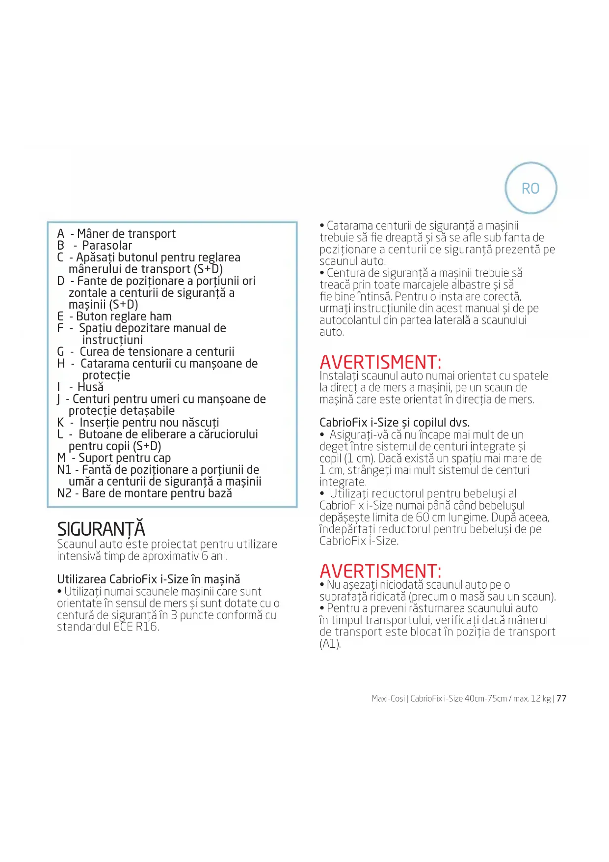 A - Mâner de transport B - Parasolar C - Apăsați butonul pentru reglarea mânerului de transport (S+D) D - Fante de poziționare a porțiunii ori zontale a centurii de siguranță a mașinii (S+D) E - Buton reglare ham F - Spațiu depozitare manual de instrucțiuni G - Curea de tensionare a centurii H - Catarama centurii cu manșoane de protecție I - Husă J - Centuri pentru umeri cu manșoane de protecție detașabile K - Inserție pentru nou născuți L - Butoane de eliberare a căruciorului pentru copii (S+D) M - Suport pentru cap N1 - Fantă de poziționare a porțiunii de umăr a centurii de siguranță a mașinii N2 - Bare de montare pentru bază SIGURANȚĂ Scaunul auto este proiectat pentru utilizare intensivă timp de aproximativ 6 ani. Utilizarea CabrioFix i-Size în mașină