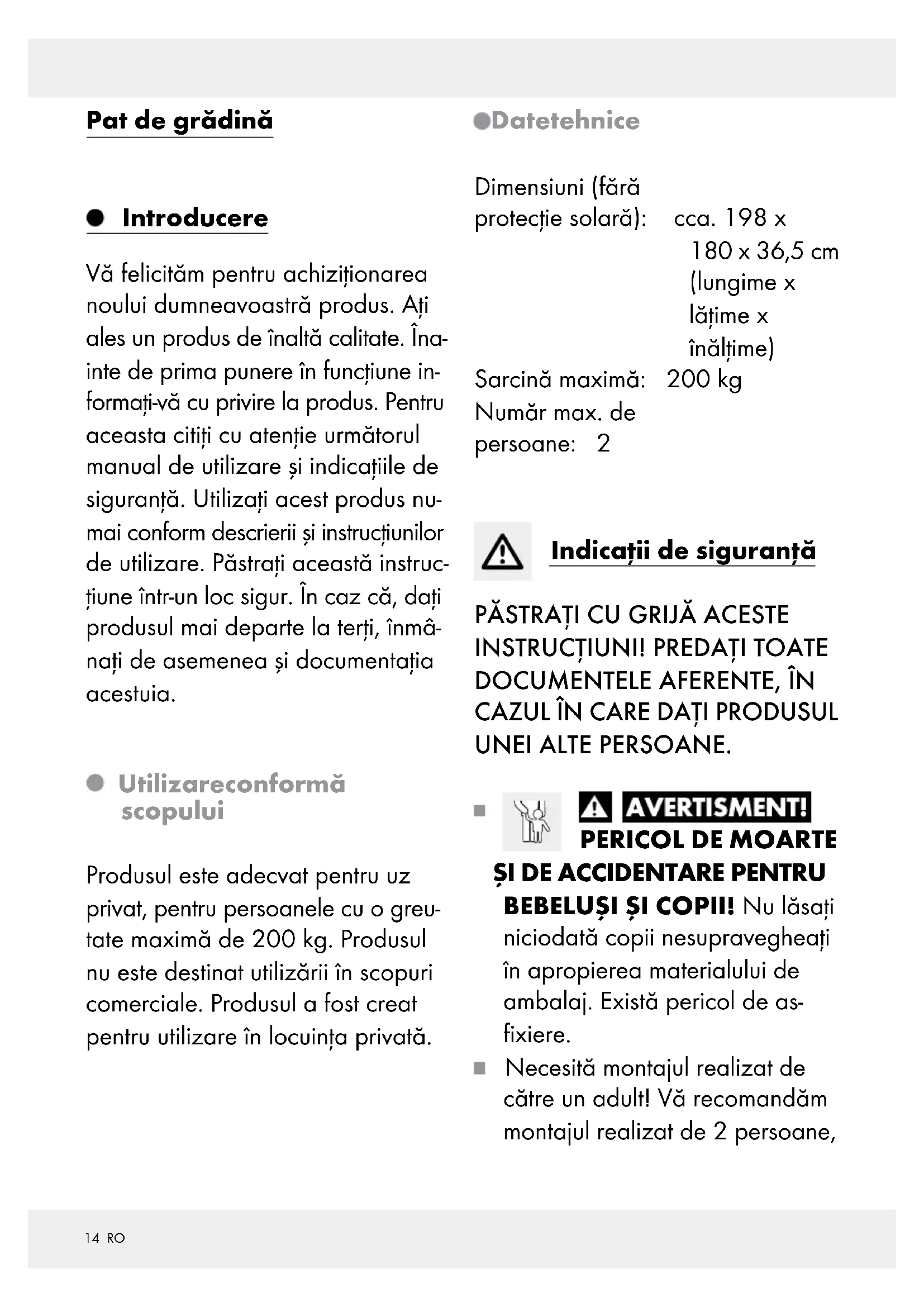 RIALE! Nu suntem răspunzători pentru accidentele, care apar datorită nerespectării indicaţiilor de siguranţă menţionate sau manipulării eronate. Curăţare și întreţinere Curăţaţi produsul cu o lavetă umedă și cu un agent de cură- ţare neagresiv. Protejaţi produsul de ploaie. Nu-l lăsaţi afară atunci când plouă. Nu expuneţi produsul în mod in- util, condiţiilor atmosferice extreme, cum ar fi temperaturi extreme, vânt şi ploaie. Depozitaţi produsul într-o încăpere protejată, uscată. Depozitaţi pro- dusul curat și uscat întotdeauna la temperatura camerei.16 RO Înlăturare Ambalajul este produs din materiale ecologice care pot fi eliminate la punctele locale de reciclare. Puteţi obţine informaţii despre posi- bilităţile de eliminare a produsului de la administraţia locală. Garanţie Produsul a fost produs cu atenţie conform unor standarde stricte de calitate şi verificat înainte de livrare. În cazul defectelor la nivelul acestui produs aveţi drepturi legale faţă de vânzătorul produslui. Aceste drepturi legale nu sunt limitate de garanţia noastră prezentată în continuare. Pentru acest produs primiţi o garanţie de 3 ani de la data achiziţiei. Peri- oada garanţiei începe la data achi- ziţiei. Vă rugăm să păstraţi bonul de casă original. Acesta reprezintă dovada achiziţiei. Dacă în decurs de 3 ani de la data achiziţiei acestui produs se înregis- trează un defect de material sau de fabricaţie, vă reparăm sau înlo- cuim gratuit produsul – la alegerea noastră – produsul. Dreptul de ga- ranţie se stinge dacă produsul este deteriorat, utilizat sau întreţinut în mod necorespunzător. Garanţia se aplică numai pentru defecte de material şi de fabricaţie. Această garanţie nu acoperă piesele componente ale produsului care prezintă umre normale de uzură și care sunt văzute ca piese de schimb sau deteriorările la nivelul pieselor casante, de exemplu întrerupătoare, acumulatori sau piese fabricate din sticlă.17 DE/AT/CH Garten-Doppelliege Einleitung Wir beglückwünschen Sie zum Kauf Ihres neuen Produkts. Sie haben sich damit für ein hochwertiges Produkt entschieden. Machen Sie sich vor der ersten Inbetriebnahme mit dem Produkt vertraut. Lesen Sie hierzu aufmerksam die nachfolgende Be- dienungsanleitung und die Sicher- heitshinweise. Benutzen Sie das Produkt nur wie beschrieben und für die angegebenen Einsatzbereiche. Bewahren Sie diese Anleitung an einem sicheren Ort auf. Händigen Sie alle Unterlagen bei Weitergabe des Produktes an Dritte mit aus. Bestimmungsgemäßer Gebrauch Das Produkt ist für den privaten Gebrauch für Personen mit einem Maximalgewicht von 200 kg geeig- net. Das Produkt ist nicht für den gewerblichen Gebrauch vorgesehen. Das Produkt wurde für den privaten Wohnbereich hergestellt. Technische Daten Abmessungen (ohne Sonnenschutz): ca. 198 x 180 x 36,5 cm (L x B x H) Max. Belastbarkeit: 200 kg Max Personenzahl: 2 Sicherheitshinweise
