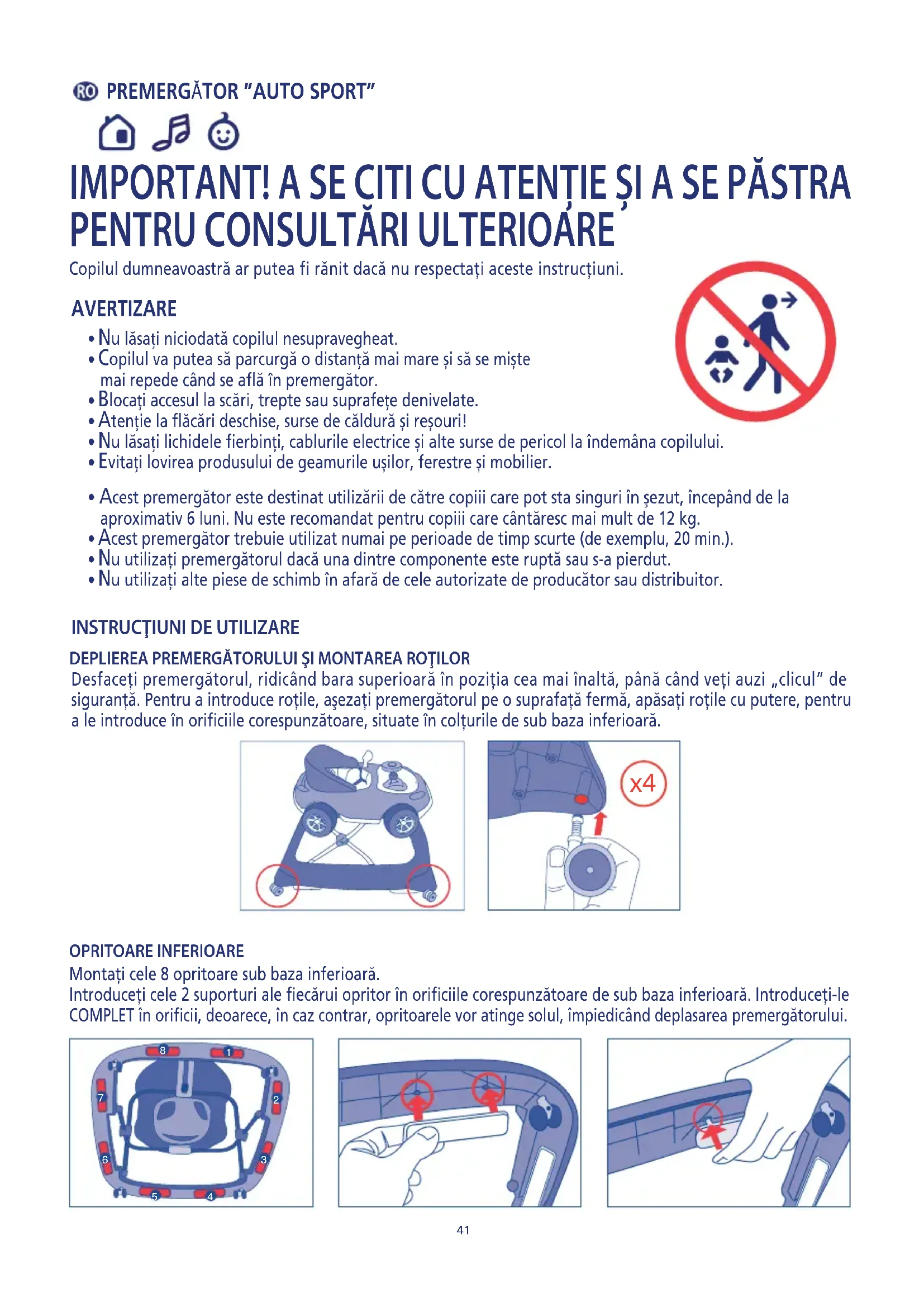 (A) (B) OK41 OPRITOARE INFERIOAREMontaţi cele 8 opritoare sub baza inferioară.Introduceţi cele 2 suporturi ale fiecărui opritor în orificiile corespunzătoare de sub baza inferioară. Introduceţi-le COMPLET în orificii, deoarece, în caz contrar, opritoarele vor atinge solul, împiedicând deplasarea premergătorului.DEPLIEREA PREMERGĂTORULUI ŞI MONTAREA ROŢILORDesfaceţi premergătorul, ridicând bara superioară în poziţia cea mai înaltă, până când veţi auzi „clicul” de siguranţă. Pentru a introduce roţile, aşezaţi premergătorul pe o suprafaţă fermă, apăsaţi roţile cu putere, pentru a le introduce în orificiile corespunzătoare, situate în colţurile de sub baza inferioară.