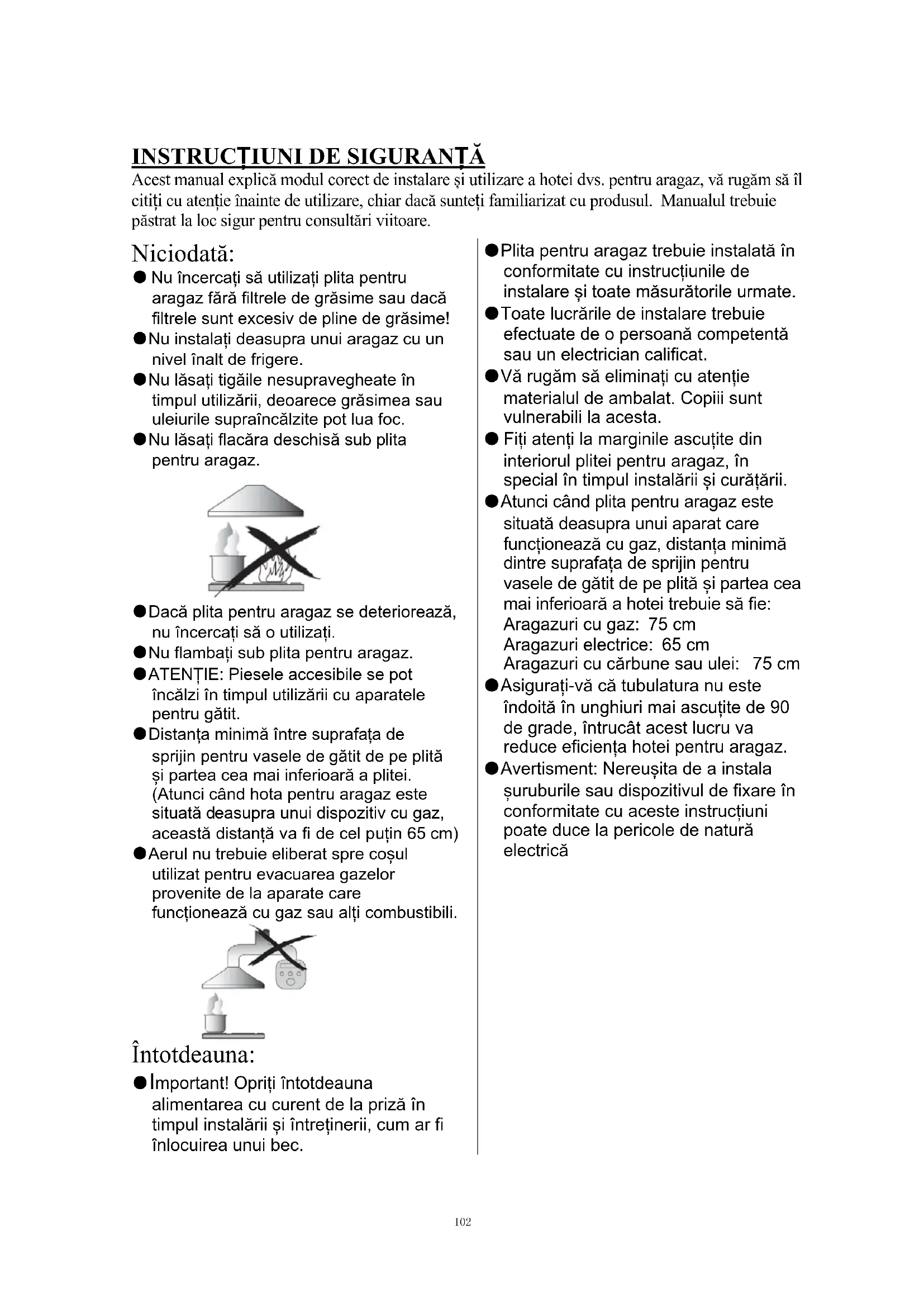 Acest manual explică modul corect de instalare și utilizare a hotei dvs. pentru aragaz, vă rugăm să îl citiți cu atenție înainte de utilizare, chiar dacă sunteți familiarizat cu produsul. Manualul trebuie păstrat la loc sigur pentru consultări viitoare. Niciodată: ● Nu încercați să utilizați plita pentru aragaz fără filtrele de grăsime sau dacă filtrele sunt excesiv de pline de grăsime! ●Nu instalați deasupra unui aragaz cu un nivel înalt de frigere. ●Nu lăsați tigăile nesupravegheate în timpul utilizării, deoarece grăsimea sau uleiurile supraîncălzite pot lua foc. ●Nu lăsați flacăra deschisă sub plita pentru aragaz. ●Dacă plita pentru aragaz se deteriorează, nu încercați să o utilizați. ●Nu flambați sub plita pentru aragaz. ●ATENȚIE: Piesele accesibile se pot încălzi în timpul utilizării cu aparatele pentru gătit. ●Distanța minimă între suprafața de sprijin pentru vasele de gătit de pe plită și partea cea mai inferioară a plitei. (Atunci când hota pentru aragaz este situată d easupra unui dispozitiv cu gaz, această distanță va fi de cel puțin 65 cm) ●Aerul nu trebu ie eliberat spre coșul utilizat pentru evacuarea gazelor provenite de la aparate care funcționează cu gaz sau alți combustibili. Întotdeauna: ●Important! Opriți întotdeauna alimentarea cu curent de la priză în timpul instalării și întreținerii, cum ar fi înlocuirea unui bec. ●Plita pentru aragaz trebuie instalată în conformitate cu instrucțiunile de instalare și toate măsurătorile urmate. ●Toate lucrările de instalare trebuie efectuate de o persoană competentă sau un electrician calificat. ●Vă rugăm să eliminați cu atenție materialul de ambalat. Copiii sunt vulnerabili la acesta. ● Fiți atenți la marginile ascuțite din interiorul plitei pentru aragaz, în special în timpul instalării și curățării. ●Atunci când plita pentru aragaz este situată deasupra unui aparat care funcționează cu gaz, distanța minimă dintre suprafața de sprijin pentru vasele de gătit de pe plită și partea cea mai inferioară a hotei trebuie să fie: Aragazuri cu gaz: 75 cm Aragazuri electrice: 65 cm Aragazuri cu cărbune sau ulei: 75 cm ●Asigurați-vă că tubulatura nu este îndoită în unghiuri mai ascuțite de 90 de grade, întrucât acest lucru va reduce eficiența hotei pentru aragaz. ●Avertisment: Nereușita de a instala șuruburile sau dispozitivul de fixare în conformitate cu aceste instrucțiuni poate duce la pericole de natură electrică 102Întotdeauna: ●Puneți capacele deasupra oalelor și tigăilor atunci când gătiți pe un aragaz care funcționează cu gaz. ●În modul de extracție, aerul din cameră este eliminat prin plita pentru aragaz. Asigurați-vă că se implementează măsuri adecvate de aerisire. Hota pentru aragaz elimină mirosurile din cameră, dar nu și aburul. ●Hota pentru aragaz este strict de uz casnic. ●Dacă cablul de alimentare este deteriorat, acesta trebuie înlocuit de către producător, agentul său de service sau persoane cu calificări similare pentru a evita pericolele. ●Acest aparat poate fi utilizat de către copiii cu vârste de minim 8 ani și de către persoanele cu capacități fizice, senzoriale sau mentale reduse sau cu lipsă de experiență sau cunoștințe cu condiția să fie supravegheate sau instruite corespunzător privind modul de utilizare a acestui aparat în mod sigur și să înțeleagă pericolele implicate. Copiii nu se vor juca cu aparatul. Curățarea și întreținerea de către utilizator nu vor fi efectuate de copii fără supraveghere. ●Avertisment: Înainte de a obține accesul la terminale, trebuie deconectate toate circuitele de alimentare. Întotdeauna: ●Atenție: Aparatul și piesele sale accesibile se pot înfierbânta în timpul funcționării. Fiți atenție să evitați atingerea elementelor care se încălzesc. Copiii cu vârste mai mici de 8 ani trebuie să se ferească, cu condiția să fie sub supraveghere permanentă. ●Trebuie să existe aerisirea adecvată a camerei atunci când se utilizează hota pentru aragaz în același timp cu aparatele care ard gaz sau alți combustibili. ●Există riscul de incendiu dacă curățarea nu este efectuată în conformitate cu instrucțiunile ●Regulamentele privind eliminarea aerului trebuie satisfăcute. ●Curățați aparatul periodic urmând metoda descrisă în capitolul ÎNTREȚINERE. ●Din motive de siguranță, vă rugăm să utilizați șuruburi de fixare sau instalare de aceeași dimensiune, care sunt recomandate în acest manual de instrucțiun
