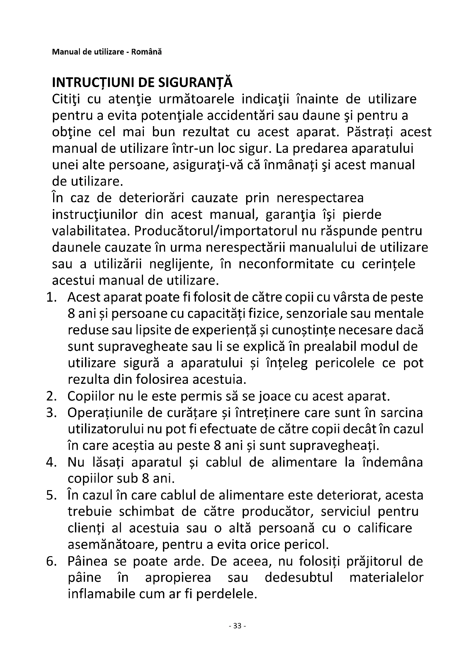 Citiţi cu atenţie următoarele indicaţii înainte de utilizare pentru a evita potenţiale accidentări sau daune şi pentru a obţine cel mai bun rezultat cu acest aparat. Păstrați acest manual de utilizare într-un loc sigur. La predarea aparatului unei alte persoane, asiguraţi-vă că înmânați şi acest manual de utilizare. În caz de deteriorări cauzate prin nerespectarea instrucţiunilor din acest manual, garanţia îşi pierde valabilitatea. Producătorul/importatorul nu răspunde pentru daunele cauzate în urma nerespectării manualului de utilizare sau a utilizării neglijente, în neconformitate cu cerințele acestui manual de utilizare.