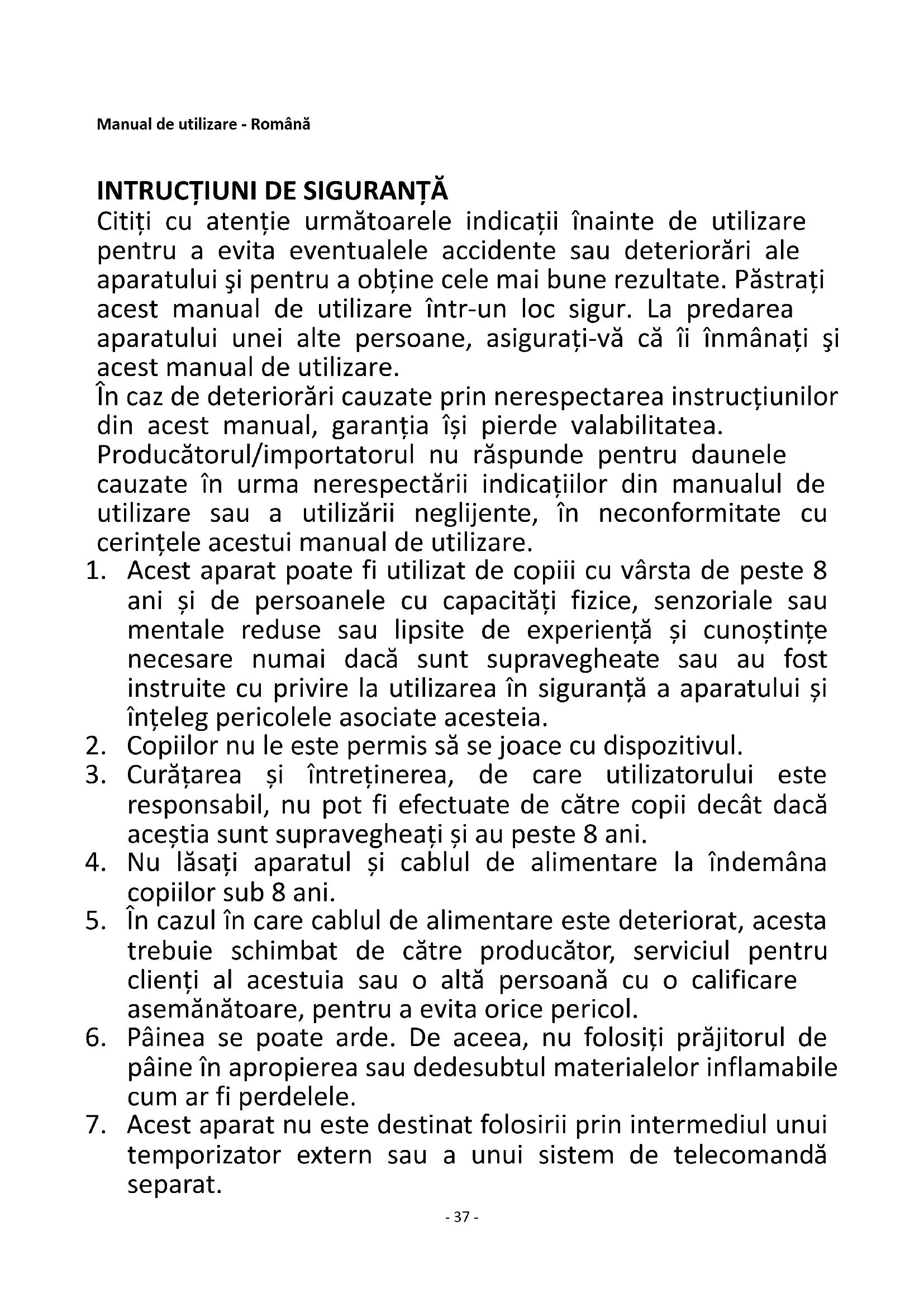 firimiturile din interior să cadă. Curățați tava pentru firimituri în mod regulat pentru a evita ca firimiturile să se adune în prăjitor.- 41 - DATE TEHNICE Tensiune nominală: 220-240 V ~ 50-60Hz Consum de putere: 600-700W